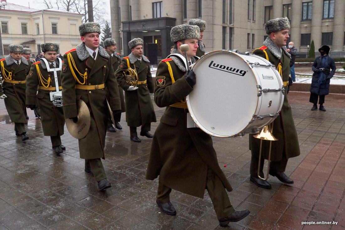 В 13:00 церемония прощания с Вячеславом Кебичем закончилась. Люди выстроились на улице, чтобы присутствовать при вынесении гроба. Чуть дальше от их выстроился почетный караул.