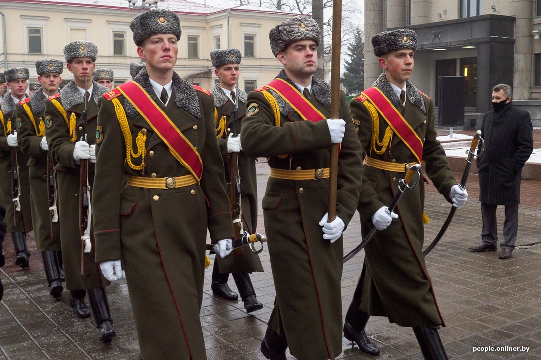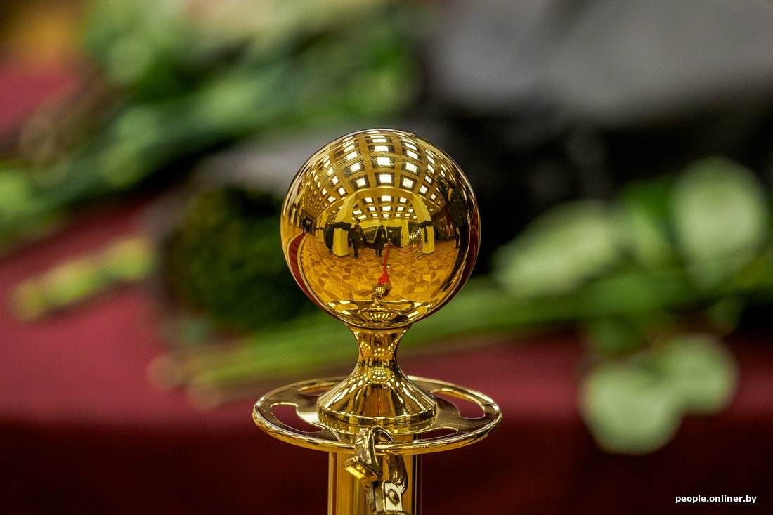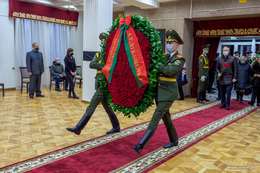 К этому времени два человека из почетного караула вносят в зал большой венок в красно-зеленых тонах от Александра Лукашенко, конкурента Кебича на выборах 1994 года.