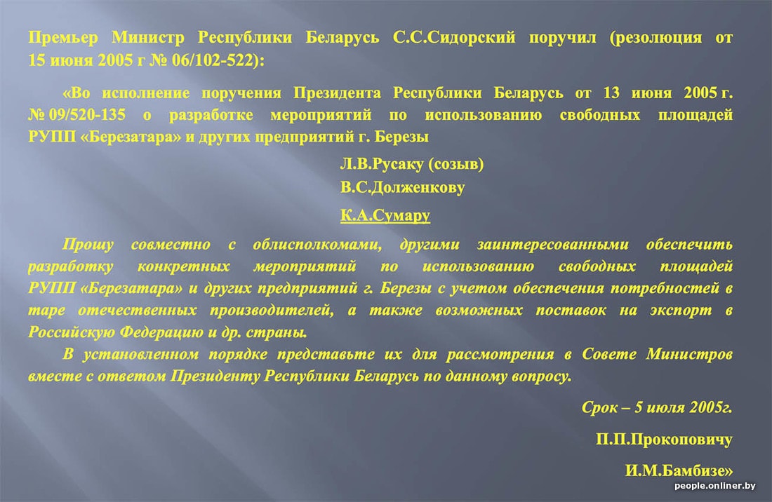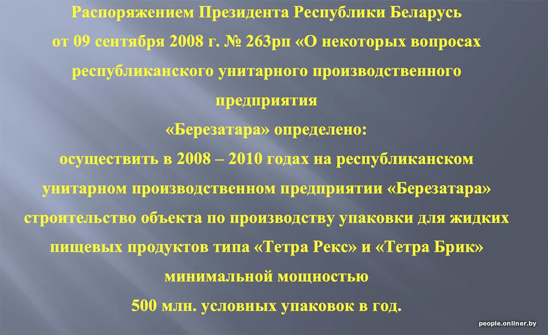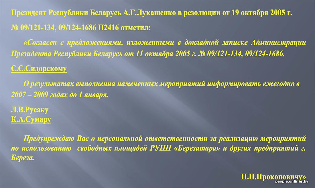 «В декабре 2003 года на торжественный запуск 4-го реконструированного блока прибыл президент. Пролетая на вертолете над Березой, Александр Лукашенко обратил внимание на странную картину: длинные ряды производственных построек, а территория безлюдна. А как известно, наш глава государства бесхозяйственности не любит. Поэтому тут же и дал поручение: разработать план по эффективному использованию мощностей. Обещал лично проверить во время следующего визита в Белоозерск.