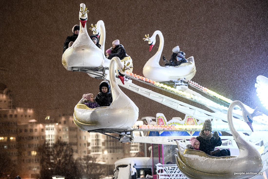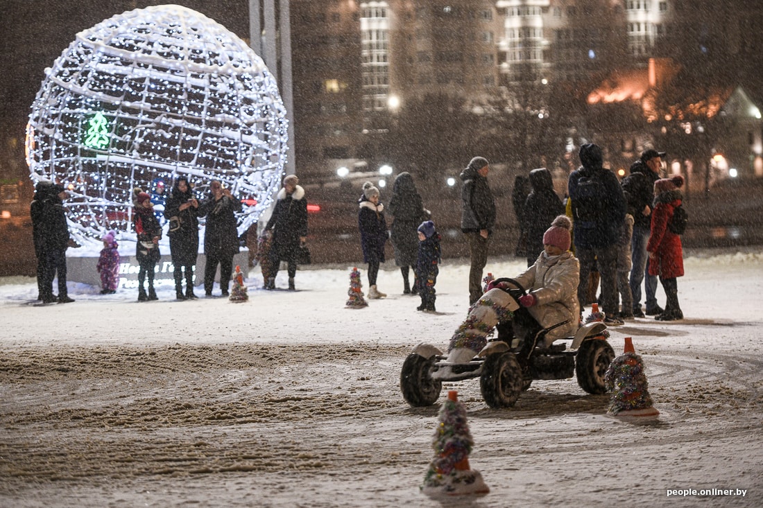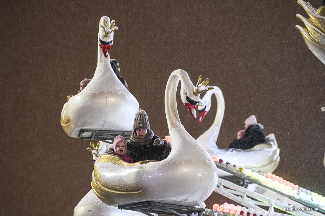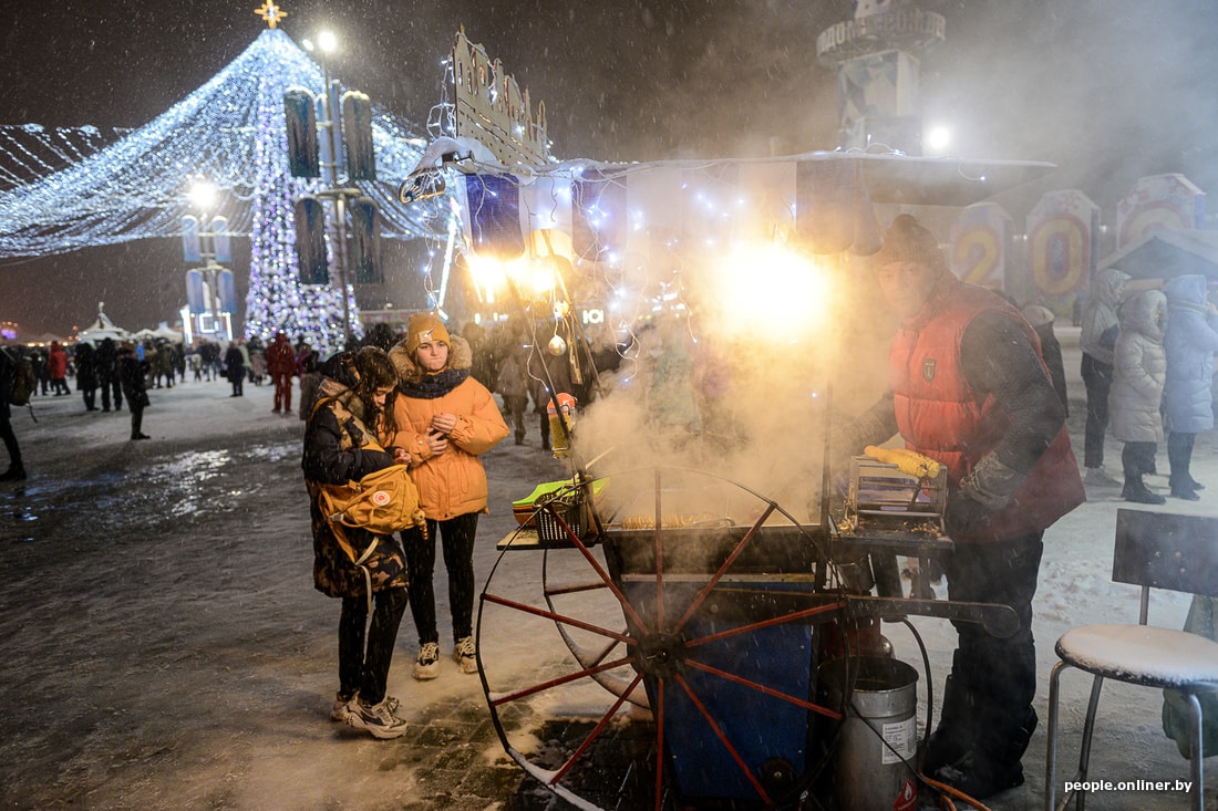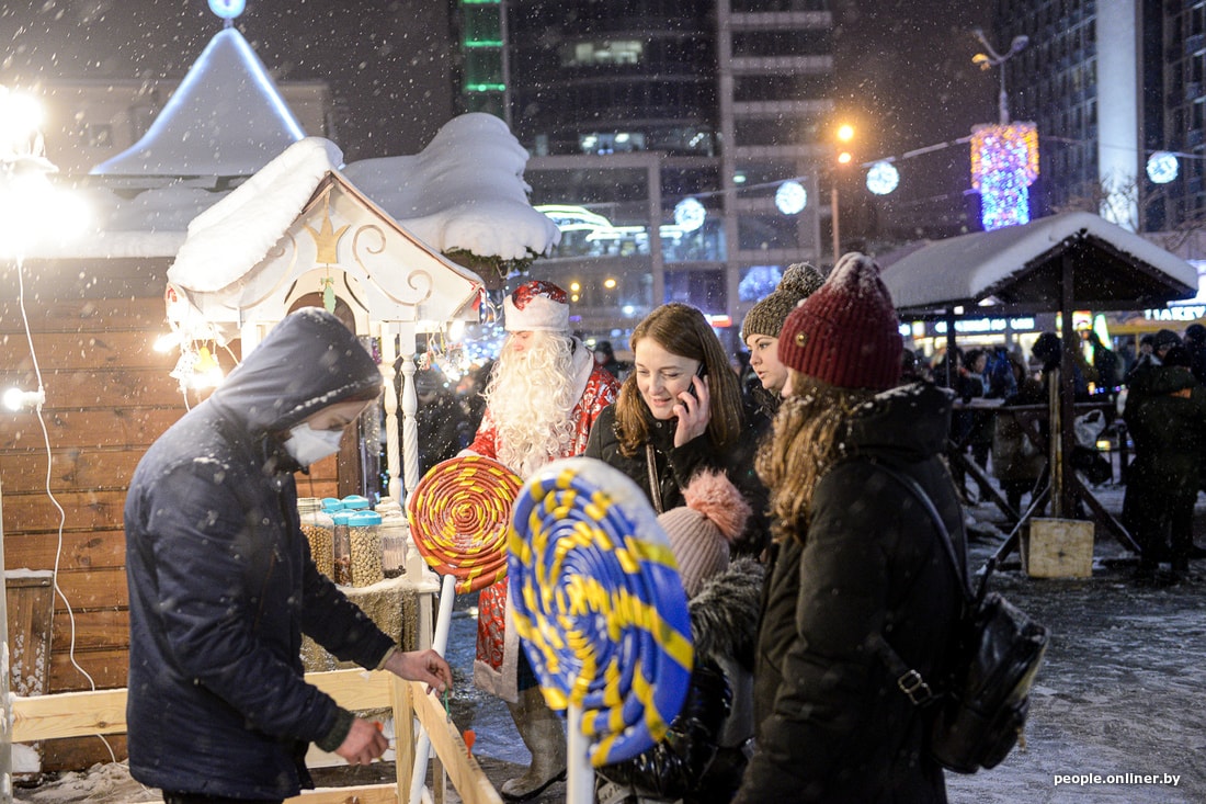 В центре Минска, возле Дворца спорта, обустроили весьма большую ярмарку с аттракционами и трассой для покатушек на машинках. Пришло много семей с детьми, атмосфера праздничная и дружелюбная. Цены тоже вполне приятные: по пять рублей стоят глинтвейн, грог и каштаны, также можно найти свиной шашлык. Есть мясо, с которого поднимается на морозе густой пар — отдельное удовольствие.
