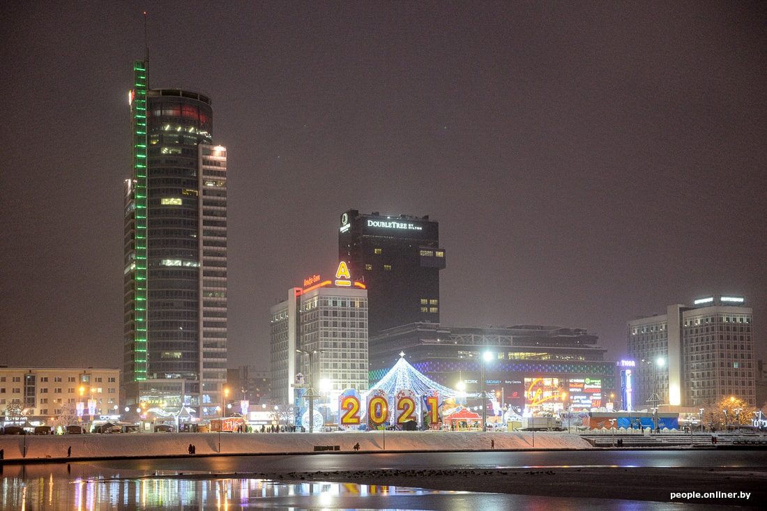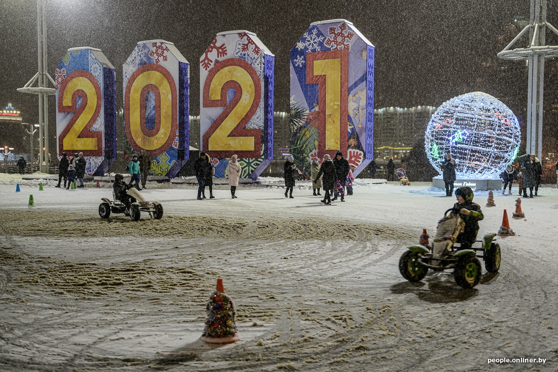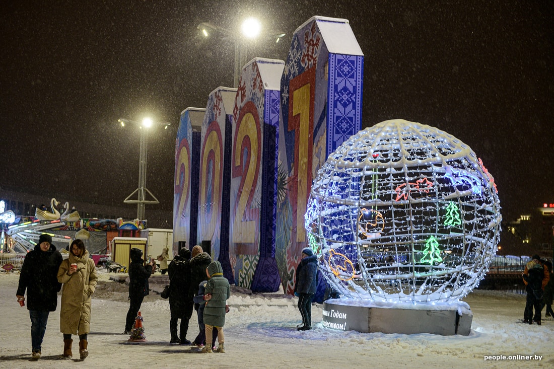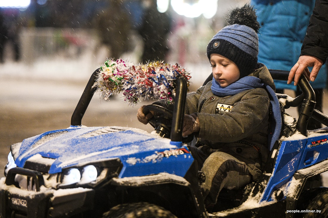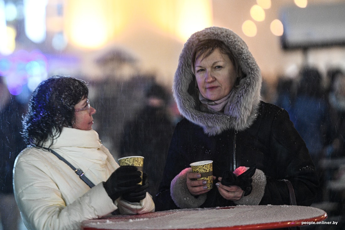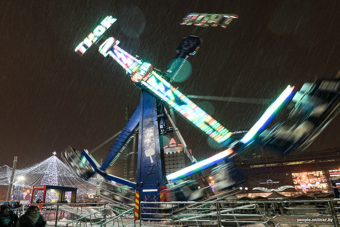 В центре Минска, возле Дворца спорта, обустроили весьма большую ярмарку с аттракционами и трассой для покатушек на машинках. Пришло много семей с детьми, атмосфера праздничная и дружелюбная. Цены тоже вполне приятные: по пять рублей стоят глинтвейн, грог и каштаны, также можно найти свиной шашлык. Есть мясо, с которого поднимается на морозе густой пар — отдельное удовольствие.