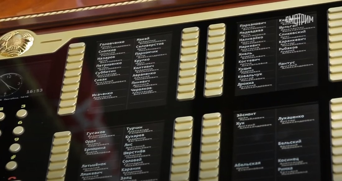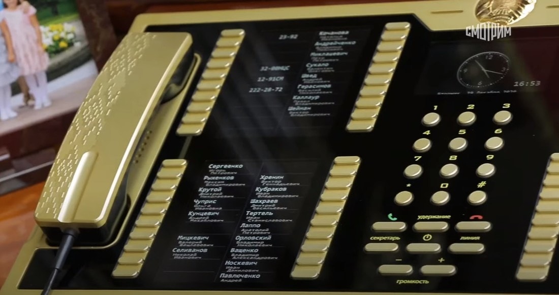 Александр Лукашенко дал интервью телеканалу «Россия 1», во время которого предложил журналистке Наиле Аскер-заде в ответ на ее вопрос о телефоне взглянуть на него своими глазами. Массивный аппарат с гербом в верхней части окрашен в черное с золотом, на панели рядом с кнопками вызова — фамилии людей.