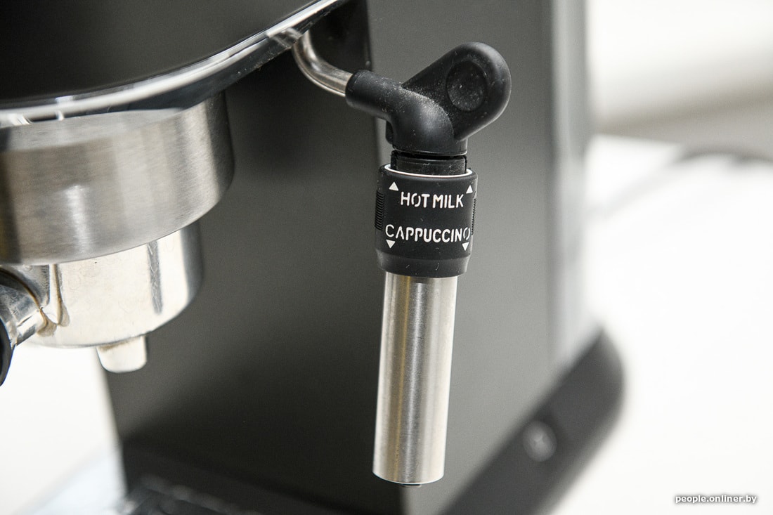 На корпусе сверху находятся три кнопки: одна порция, две (кнопки программируемые), пар. Трубка пара имеет регулировочное кольцо, позволяющее взбить молоко в пену или просто нагреть.