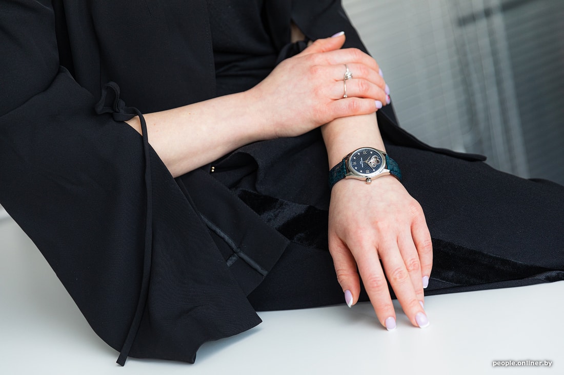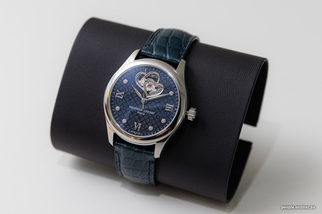 Ну и наконец, самые дорогие часы из подборки. Модель класса люкс. Тоже Swiss-made, но уже механические, с запасом хода почти 40 часов. Корпус из нержавеющей стали с покрытием из розового золота и темно-синим ремешком из кожи аллигатора. Имеют прозрачную заднюю крышку и устойчивое к царапинам сапфировое стекло. Циферблат темно-синего цвета с шестью бриллиантами. Стрелки из розового золота имеют ручную полировку.