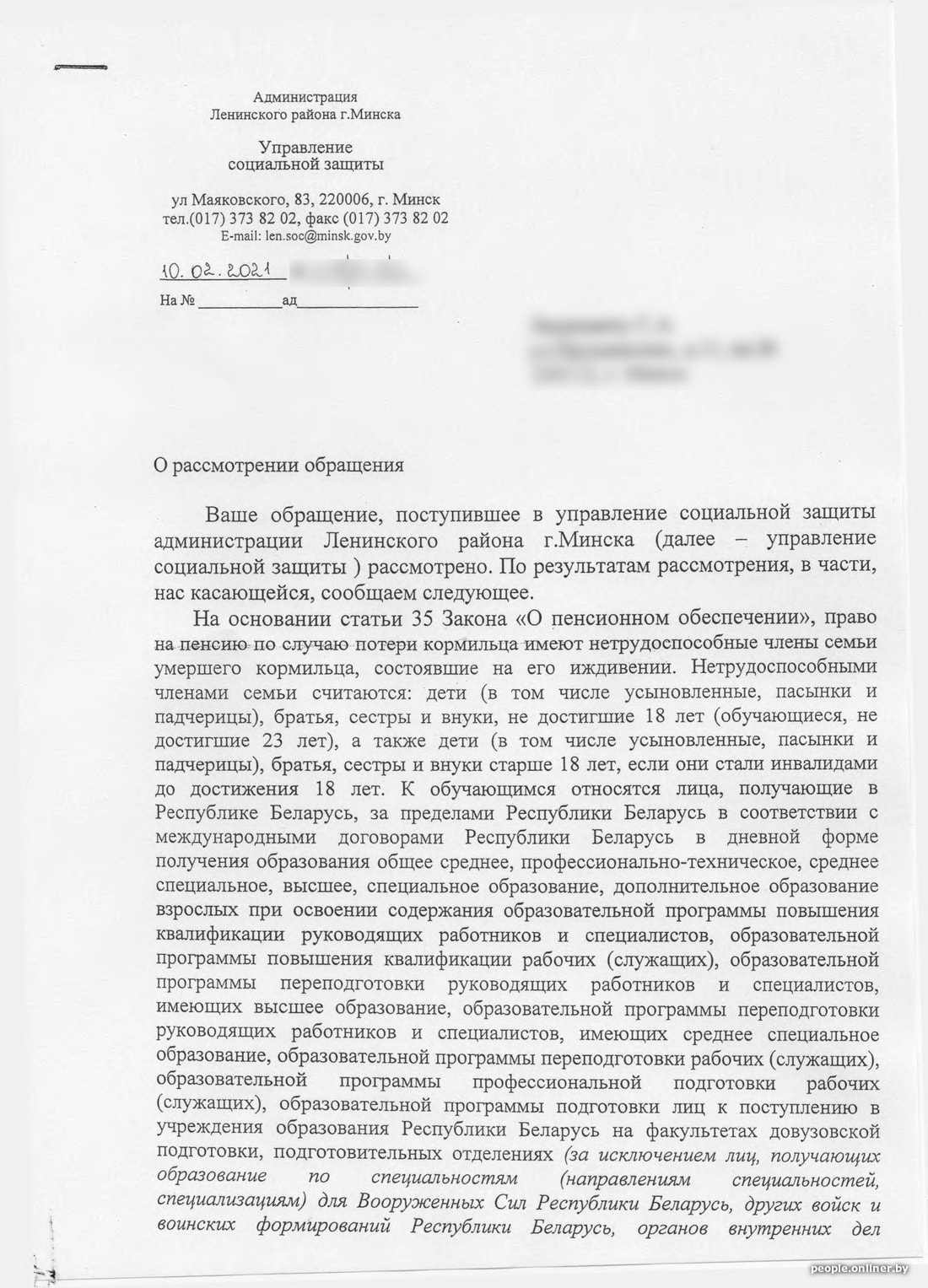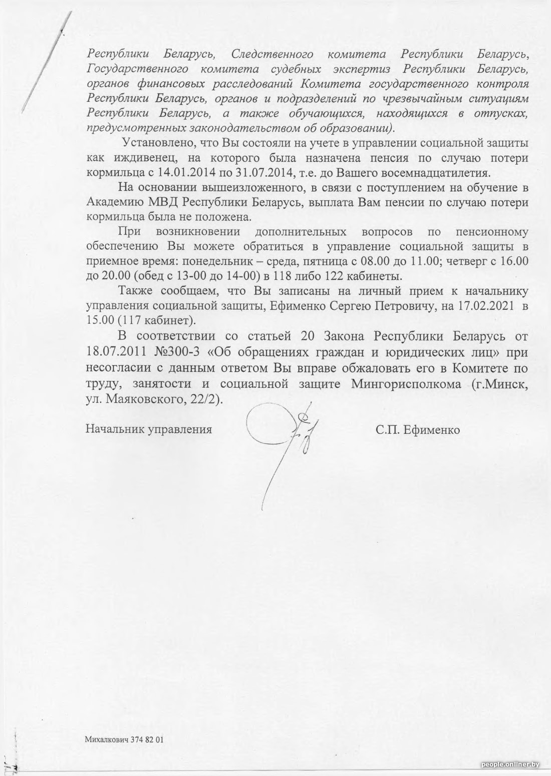 В управлении социальной защиты Ленинского района Минска в ответ на письмо Сергея подтвердили, что в связи с поступлением в Академию МВД выплата пенсии была не положена.