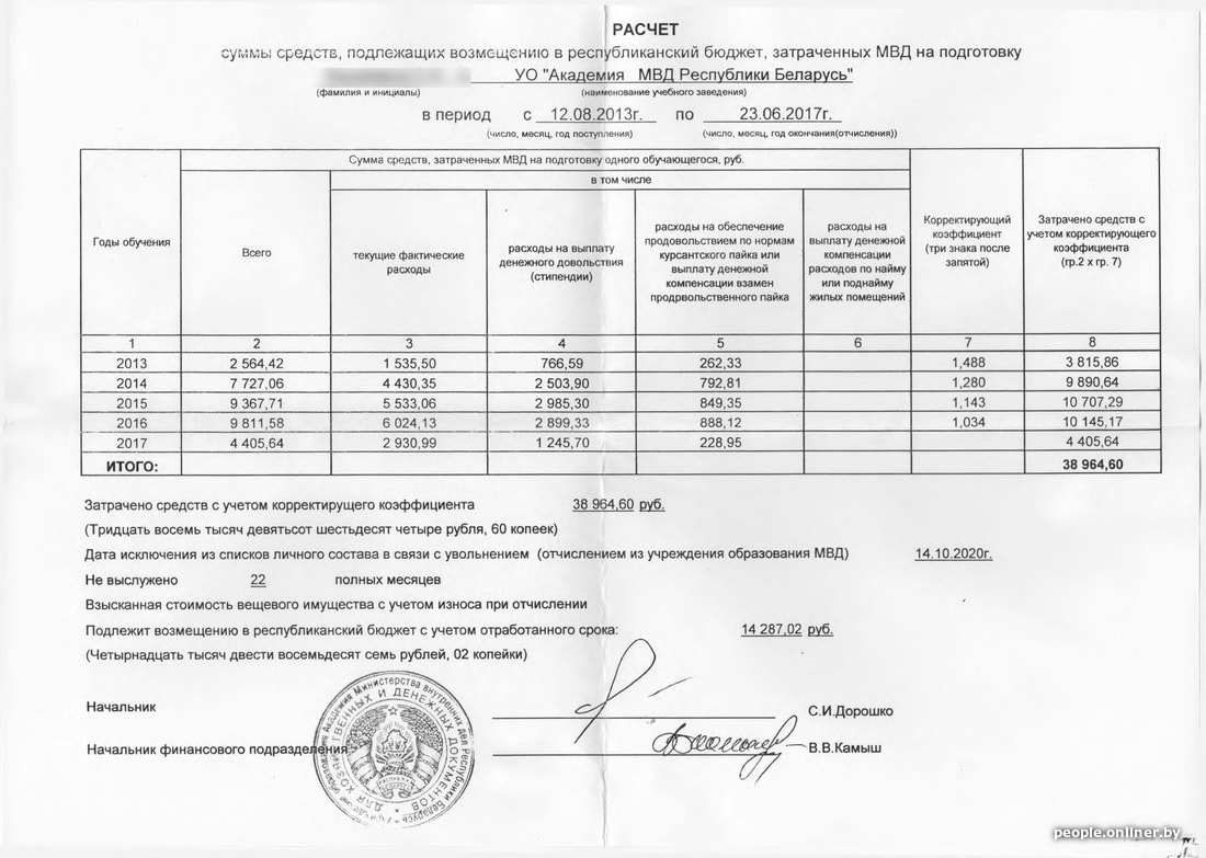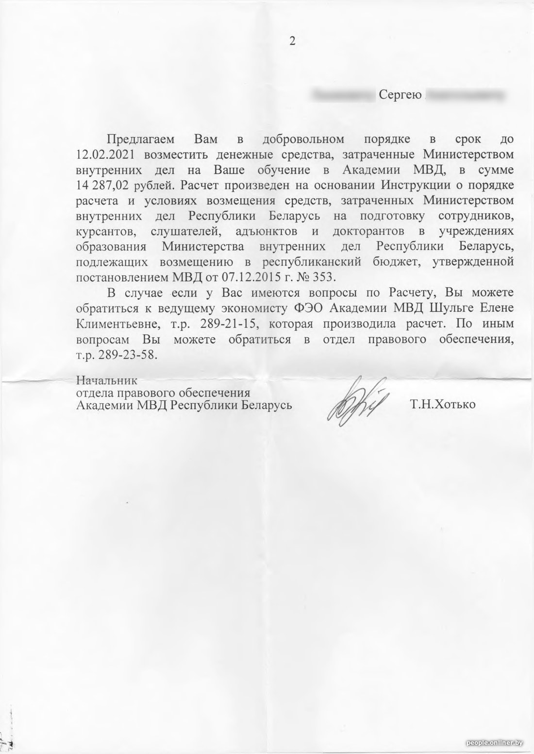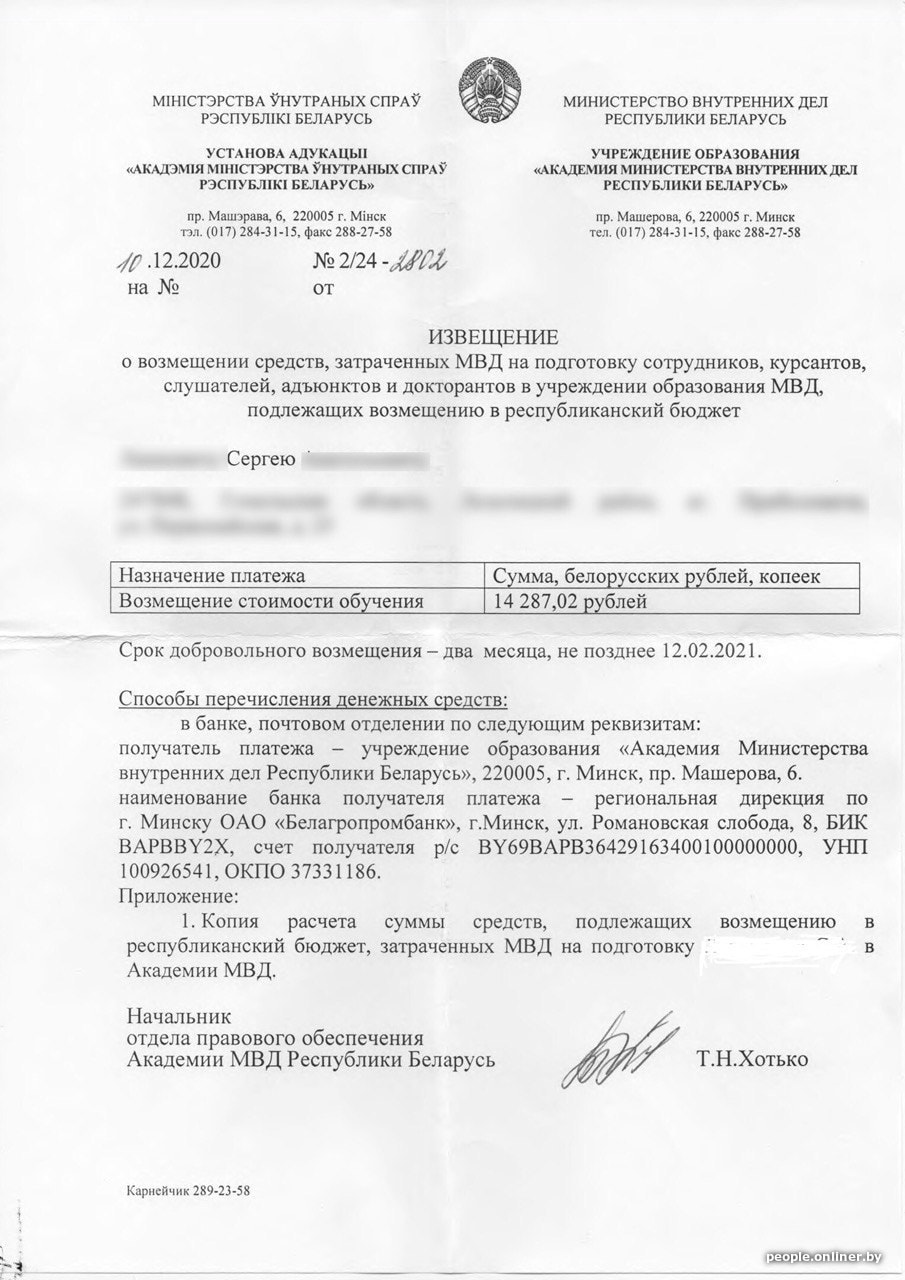 На днях пришел официальный ответ из Министерства внутренних дел. «В соответствии с частью второй пункта 191 Положения о прохождении службы в органах внутренних дел Республики Беларусь, утвержденного указом от 15.03.2012 №133, взыскание средств не производится в случаях, когда лица, обязанные возмещать в республиканский бюджет средства, затраченные МВД на их подготовку, повторно принимаются на службу в органы внутренних дел. Возможность освобождения от возмещения в республиканский бюджет средств, затраченных на подготовку обучающихся в учреждениях образования МВД, либо уменьшения их суммы в других случаях Положением не предусмотрена, в связи с чем законодательных оснований для пересчета суммы средств, затраченных на Вашу подготовку в Академии МВД, не имеется», — сообщается в ответе.