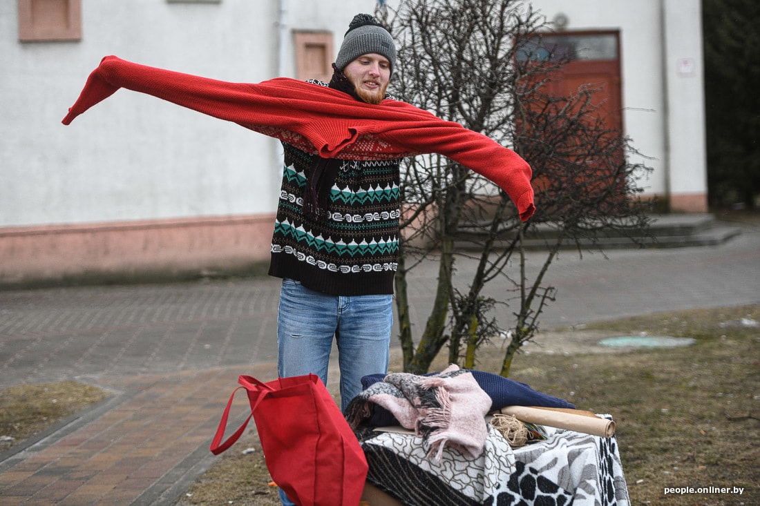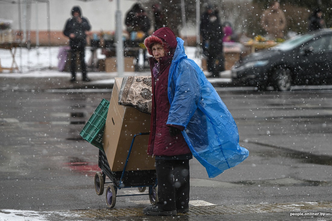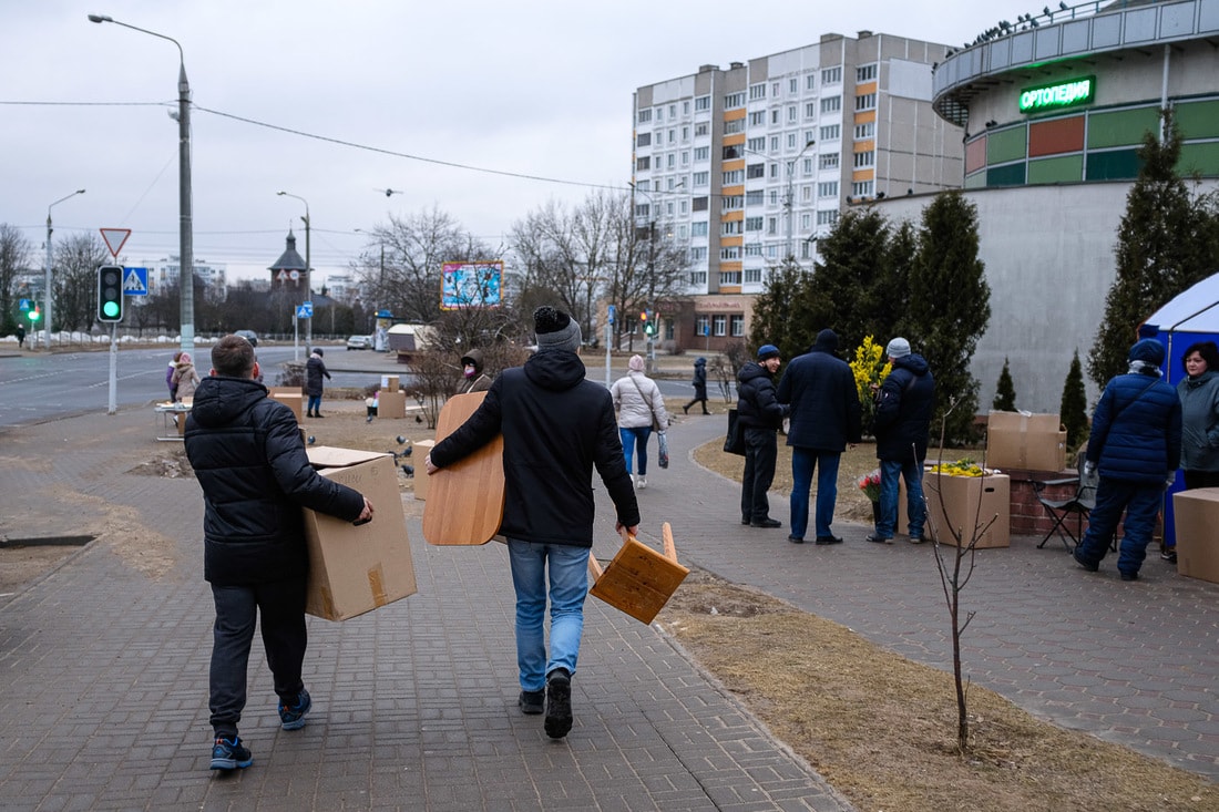Четырьмя этими экономическими терминами можно описать весь праздничный день. На улице лежит снег, ветер поутих, на термометре −5°C, но ощущается как −13°C, поэтому надеваю тройной комплект носков, свитеров и штанов. Мы пришли на свои места в восемь утра, но их кто-то занял еще со вчерашнего вечера, положив на землю картонку, а поверх нее камень. «Подло», — подумал я, отодвинул камень и начал разработку витрины. В этот раз мы использовали коробки, вырезая в них окошко, через которое хорошо видно цветы. На пятачке появились новые лица. Вообще, люди здесь далеко не «тепличники» или ремесленники (их мы вообще не заметили), а наемные работники, перекупщики, нелегалы и беженцы с рынков (там цену уронили до 1,8—1,5 рубля за цветок еще 7-го числа). Документы и разрешение так никто и не проверил — получается, в исполкоме пугали зря.
