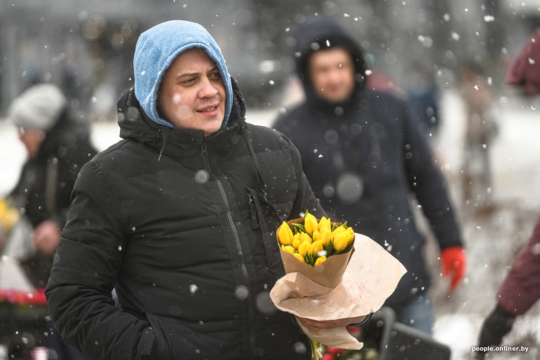 До обеда было сделано еще пару продаж, даже нарвался на злую бабку, которая сказала, что я тупой, судя по тому, что работаю продавцом и не отдаю ей цветы дешевле остальных. Но это не страшно, страшно другое: начались сильные порывы ветра, сносившие палатки (не помогали даже камни, положенные под основание), коробки с мимозами (у соседки она упала 17 раз) и тюльпанами. Отрезать бумагу или пленку было практически нереально, а если это и получалось, ветром ее вырывало из рук и уносило на дорогу под колеса машин. Затем и вовсе началась метель, а это значит, что на улице минус и нужно срочно утеплить цветы и по возможности себя, так как тот мнимый заработок вовсе не хочется тратить на таблетки.