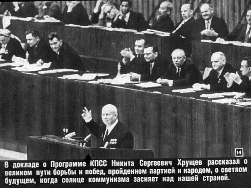 Да, до 1961 года страна жила по заветам второй программы 1919 года, которую писал Ленин с товарищами. Там про строительство социализма, много уклона в необходимость мировой революции и Красную армию, раскулачивание и создание коллективных сельских хозяйств, индустриализацию, освобождение от религиозных предрассудков, детские сады для раскрепощения женщин, бесплатное и широкое образование для распространения ценностей коммунизма и так далее. Многое из заявленного было сделано — цена вопроса не обсуждалась, но она трагична, вы знаете.