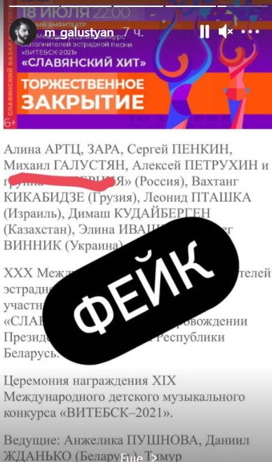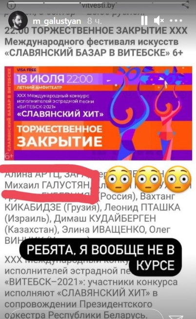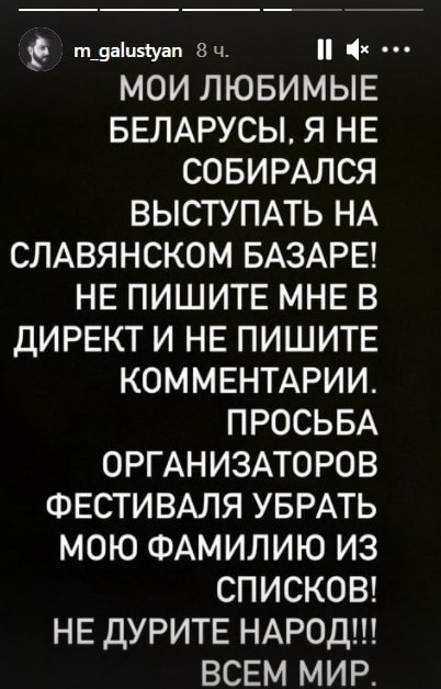 «Ребята, я вообще не в курсе, — написал Михаил Галустян в Instagram. — Я не собирался выступать на „Славянском базаре“! Не пишите мне в директ и не пишите комментарии. Просьба убрать мою фамилию из списков! Не дурите народ!!! Всем мир».