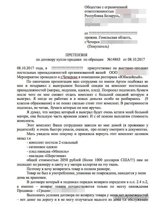 4.2. Продавец тянет сроки или вообще не отвечает. Тогда следует идти в общество защиты прав потребителей или в суд. Главное, что у вас есть доказательства (претензия с уведомлениями), что вы, как добросовестный покупатель, приняли все меры, чтобы возвратить товар продавцу в 14-дневный срок. Высока вероятность того, что суд встанет на вашу сторону, деньги вернут, а судебные издержки лягут на продавца.