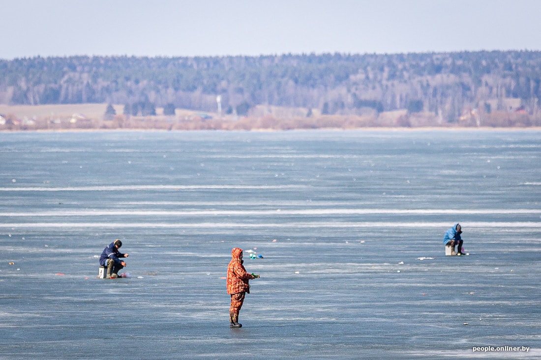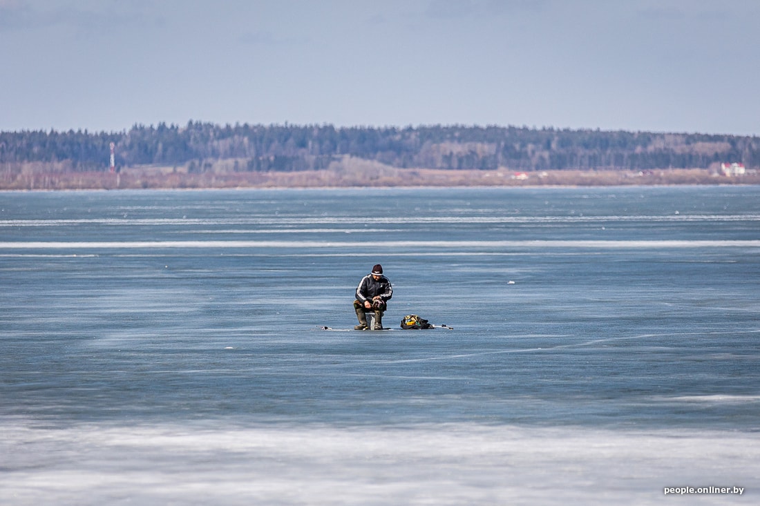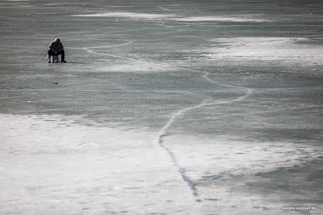 На парапете кто-то оставил рака. Членистоногий мерзавец сидел на бетоне, смотрел на рыбаков и явно чего-то ждал (а мы его еще гладили!). На берег вымело кучи желтого песка, хрустящие прошлогодние листья соревновались в скорости. На другой стороне девушка в тонком платьице позировала на лавке, молодежь жарила куриные крылышки, мужики кидали спиннинг на уже растаявшей части озера, а я стоял у подтопленной тропинки, ведущей к самым отчаянным людям страны, и не решался ступить на рыхлый, погибающий лед: чего-то в характере не хватало (спасибо маме и хорошо работающим инстинктам). А вот рыбакам, кажется, хватало всего. Ну, почти.