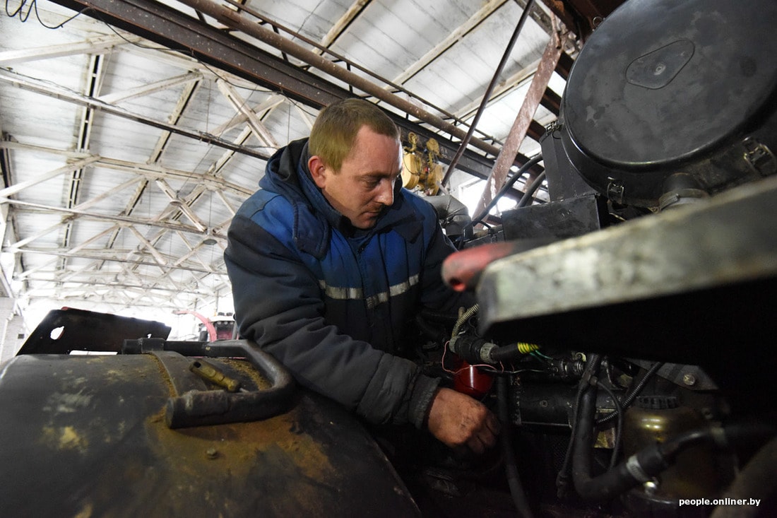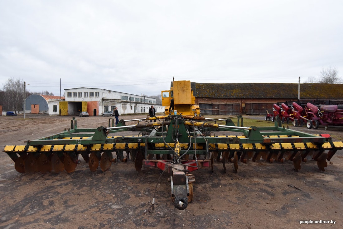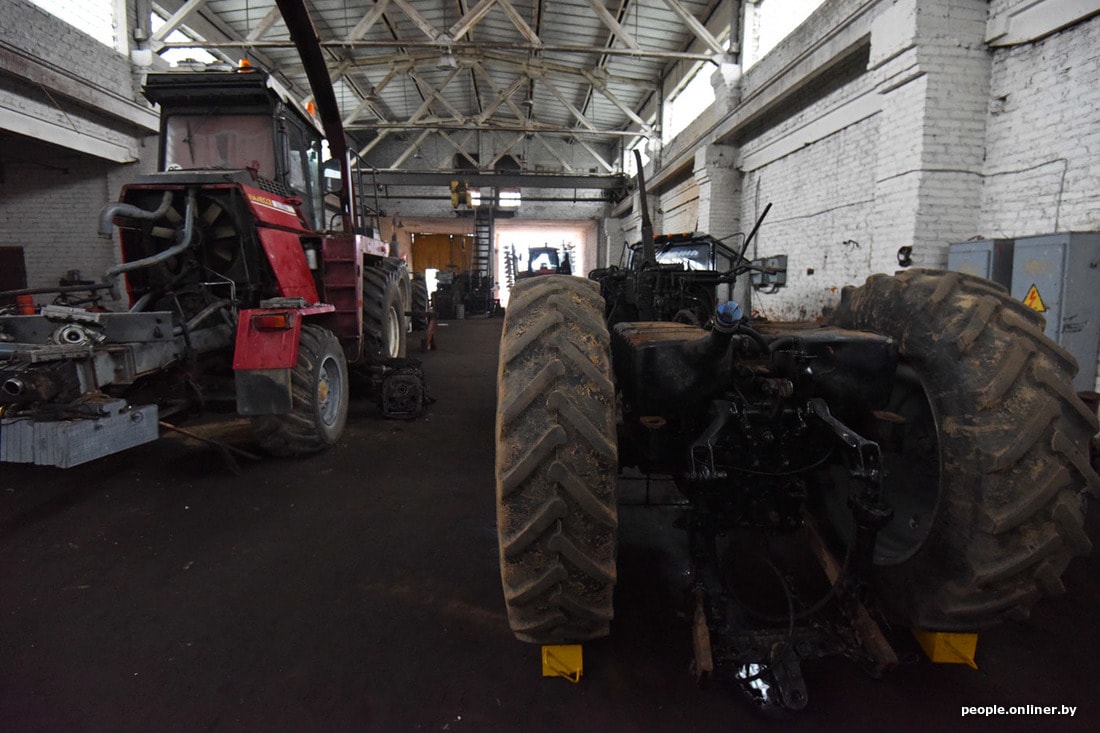 Человек в кабине — это главный инженер хозяйства Николай Еленев. Сам не местный, из Горок, пришел сюда год назад. Говорит, до того работал в России.