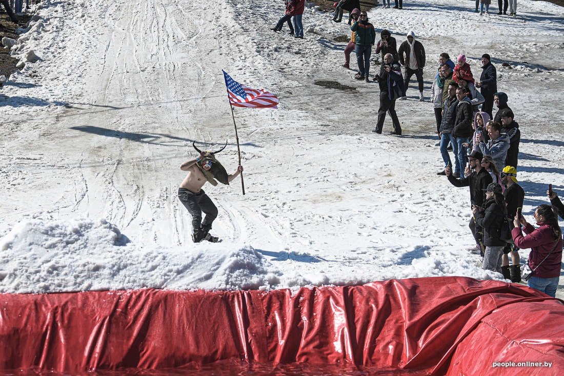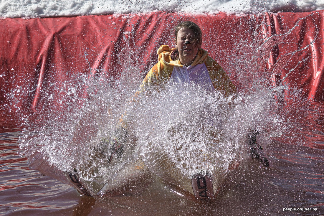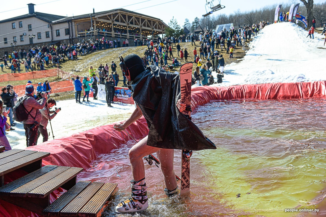 Для Логойска это уже традиция — так белорусы закрывают зимний горнолыжный сезон с 2006 года. Californication, или «Калифорняк», как его называет ведущий, — мероприятие однозначно для всех: экстремалы надевают экстравагантные наряды и мчат со склона в воду, дети участвуют в конкурсах и меряют лужи, взрослые пополняют фотоархивы и пробуют первый весенний шашлык. Первыми в красный самодельный бассейн окунулись именно дети.