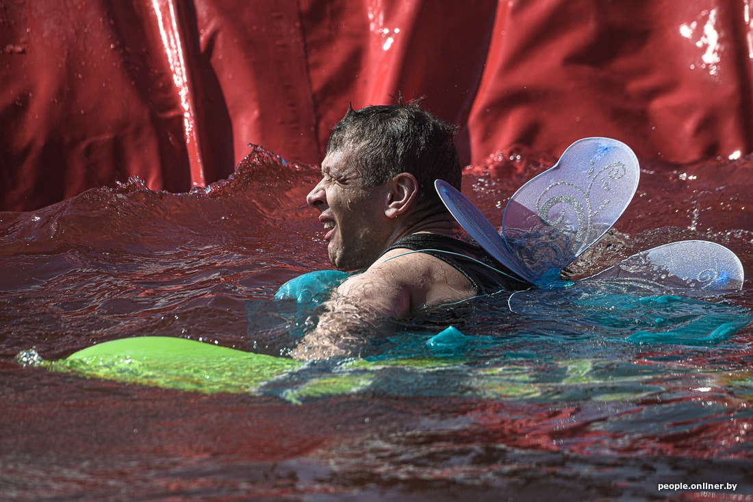 После участников могли искупнуться все желающие, но таких оказалось всего двое. Наградой стали сертификат и упаковка энергетиков. Вода в бассейне после выступления стала похожа на суп — уж много костюмов искромсалось.
