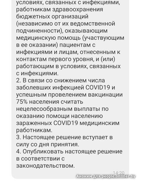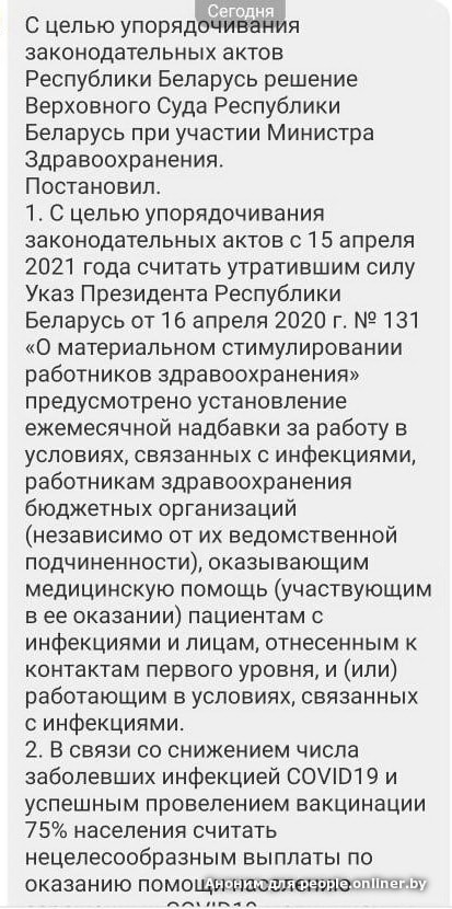 «Работаю врачом, прислали приказ, что отменяют доплаты за „ковид“», — пишет один из информаторов. И прикрепляет картинки. Якобы это путешествует по чатам врачей. Воспроизведено «решение» «Верховного Суда при участии Министра Здравоохранения». Дальше какая-то канцелярская каша с ошибками, ее суть (стиль сохранен): «В связи со снижением числа заболевших COVID19 и успешной вакцинацией 75% населения считать нецелесообразными выплаты...»