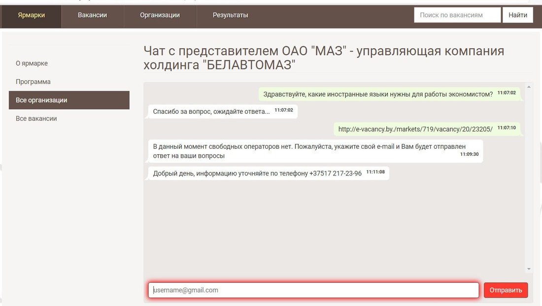 По идее организаторов, ответы на такие вопросы можно было бы получить в онлайн-режиме, ведь на сайте предусмотрели чат с потенциальными работодателями. Мы задавали вопросы пяти компаниям и получили ответ лишь от одной из них. Остальные писали, что мы должны звонить либо оставлять свою электронную почту для получения информации о работе. По сути, электронная ярмарка очень похожа на государственный поисковик работы, который работает лишь в строго определенное время.