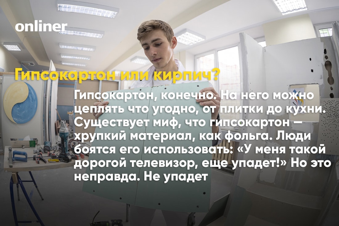 — Да, вполне (улыбается. — Прим. Onliner). Принцип один и тот же. Если в «Лего» из нескольких деталек можно собрать одну, то здесь из гипсокартона и металла — хоть потолок, хоть стену между комнатами, что угодно. Только в детском конструкторе ты обязан следовать инструкции, а умелый мастер сухого строительства проявит фантазию и изобретательность. Это мне по душе.