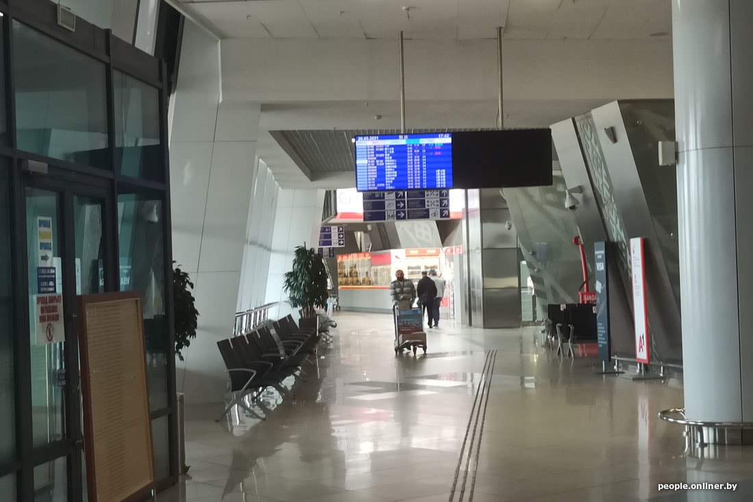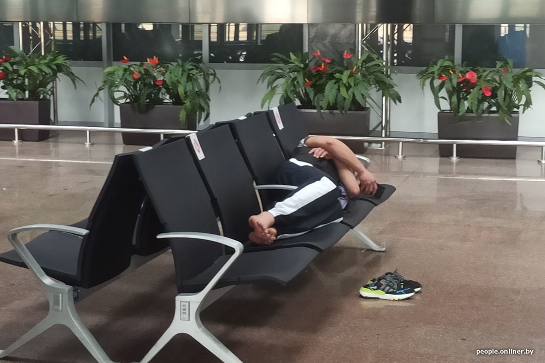 Национальный аэропорт — сердце гражданской авиации страны. Помимо авиаперелетов, на нем держались местные таксисты, кафе, расположенные внутри, и собственно персонал. В свете последних событий здесь пока никаких видимых изменений нет, все по-старому: не все двери открываются, кто-то разувшись спит на креслах или ужинает перед полетом в ближайшем ресторане. Белорусов, направлявшихся в Барселону, в аэропорту уже нет: скорее всего, они разъехались по домам. А вот иностранцев, летевших транзитом из Еревана, граждан Украины, Казахстана и Испании много. После головокружительного полета они пытаются выяснить, что, собственно, делать дальше.