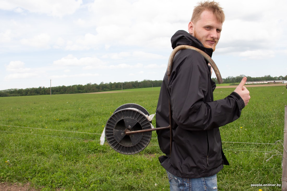 Если раньше в пастухи шли либо пенсионеры, либо дети, либо и те и другие, то сегодня пастух — специалист в сфере животноводства, а саму работу облегчил технический прогресс. Поле разделено на сектора, периметры которых ограничены проволокой. Ее натягивают с помощью самодельной конструкции «рюкзака-катушки». Вещь тяжеловатая, зато помогает держать осанку. В дальнейшем проволоку подключают к аккумулятору и подают напряжение, чтобы стадо думало, прежде чем переступить черту. Матерые пастухи напряжения на проволоке в несколько тысяч вольт уже не ощущают и могут спокойно держать «напряжение на границе» в руках, но меня ударило «нормально так», даже одернулся. Короче, проверил рефлексы, а пастухи посмеялись.