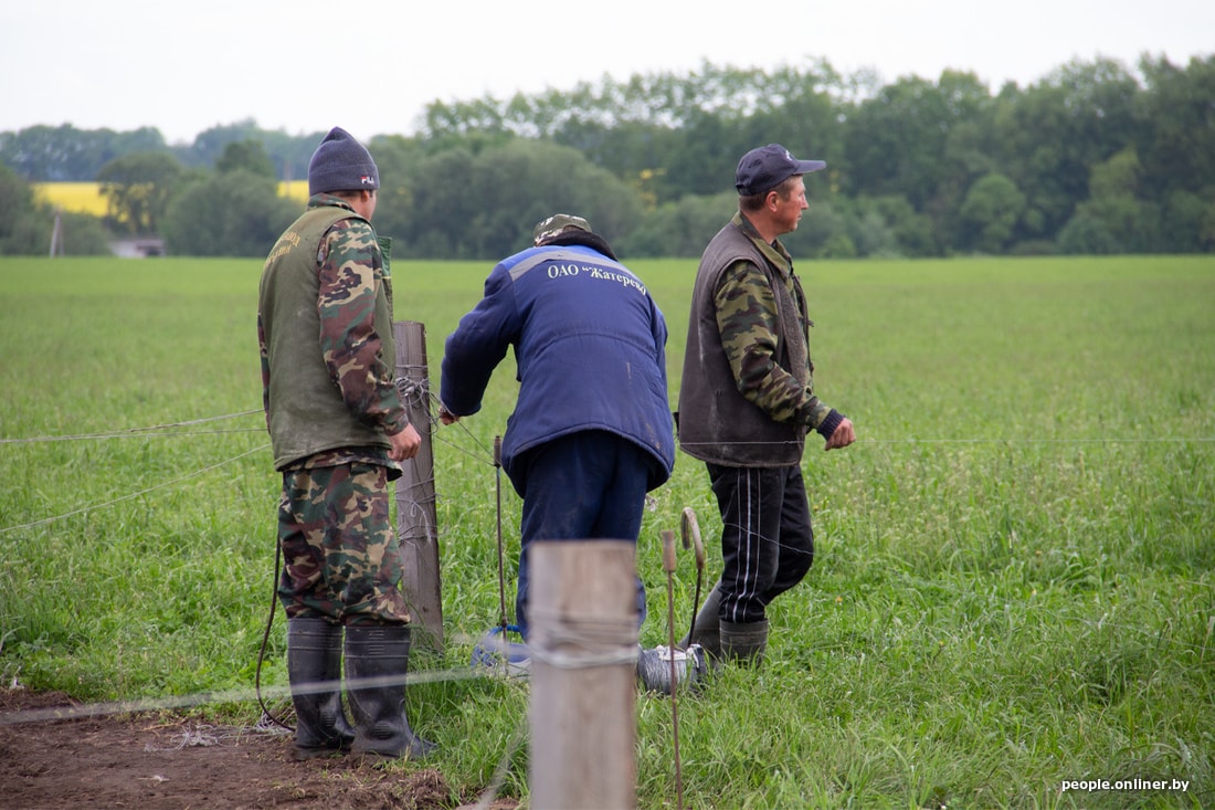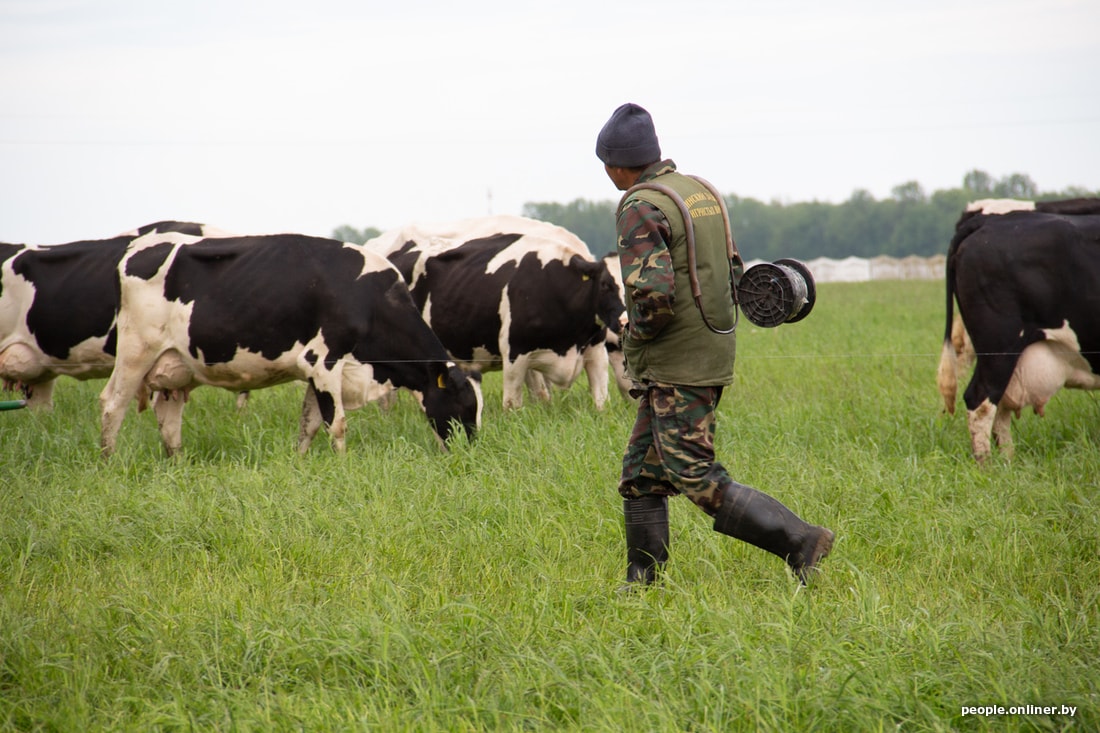 Спустя час жеваний, боданий, мычаний и заскоков друг на друга (им сильно не хватает бычьей любви и ласки) коровы почти синхронно принимают упор лежа: отдыхают. В это время трактором привозят новую цистерну с водой, а затем перегоняют коров на следующий сектор, где трава еще не едена. Общипанное поле косят трактором, чтобы зелень росла равномерно. В общем, на поле происходит постоянное движение то техники, то животных, то людей — за всем этим и наблюдает белорусский ковбой. Особое внимание уделяют машинам — по ним определяют, кто едет. Естественно, марку автомобиля начальника все знают, но все равно подрываются, если замечают клубы пыли и шум мотора.