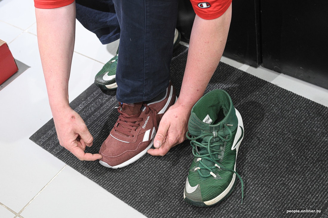 — Размер ноги у меня сейчас — 49—50-й, зависит от марки обуви. Найти ее в Беларуси — целый квест. Чаще всего самый большой размер в магазинах — 45-й или 47-й максимум. У меня вот две пары таких кроссовок: зеленые и синие, — показывает молодой человек. — Они, как и почти вся моя обувь, из Америки — у меня там родственники, поэтому периодически присылали обувь оттуда. Здесь на мою ногу могу найти только прямо башмаки-башмаки деревенские. И то еще надо поискать. Еще на «Ждановичах» можно что-то найти, но это тоже редко.