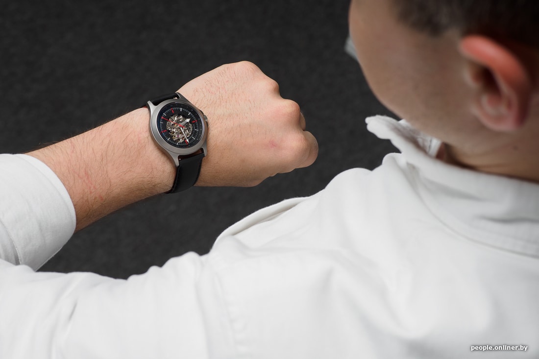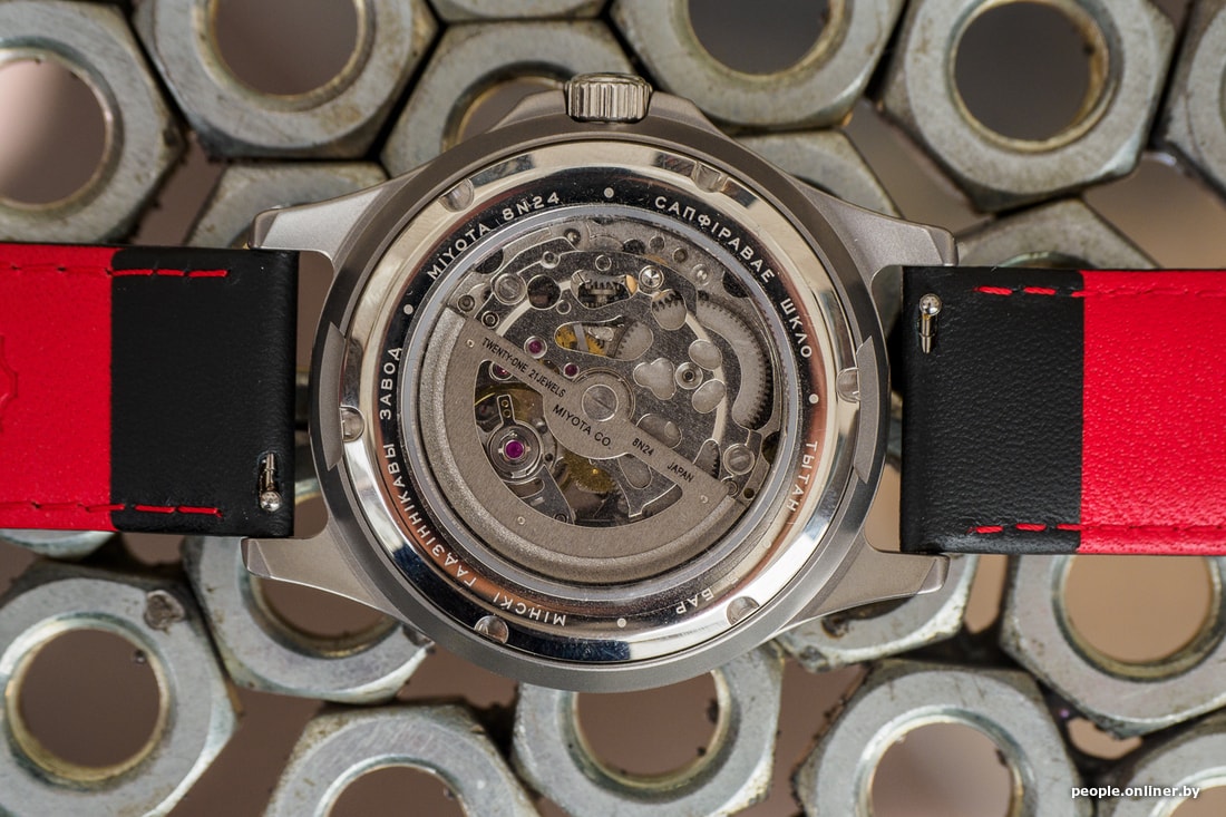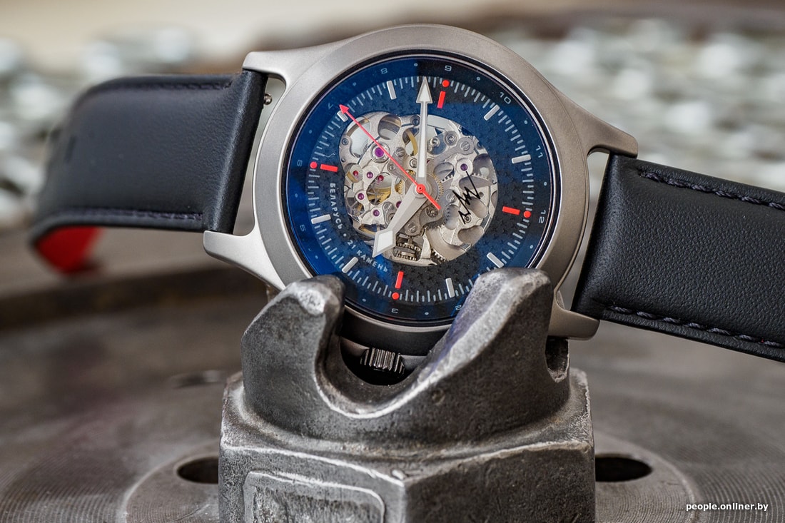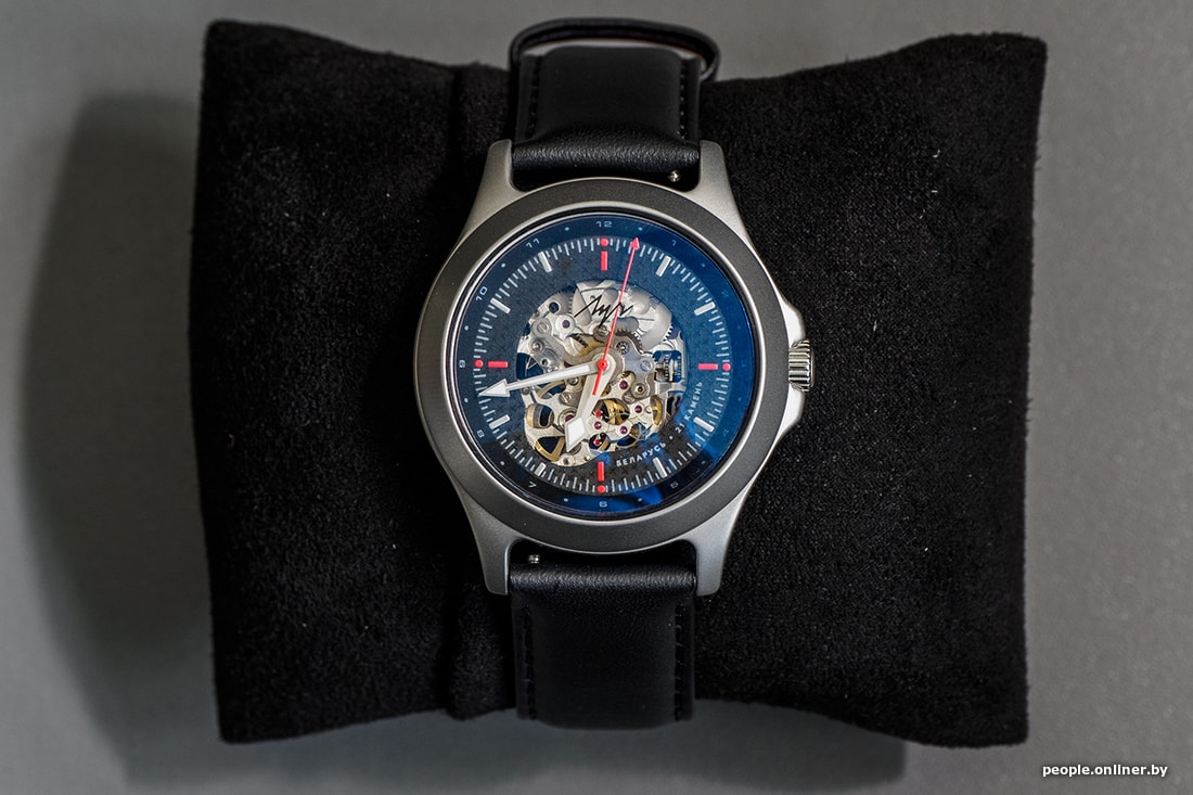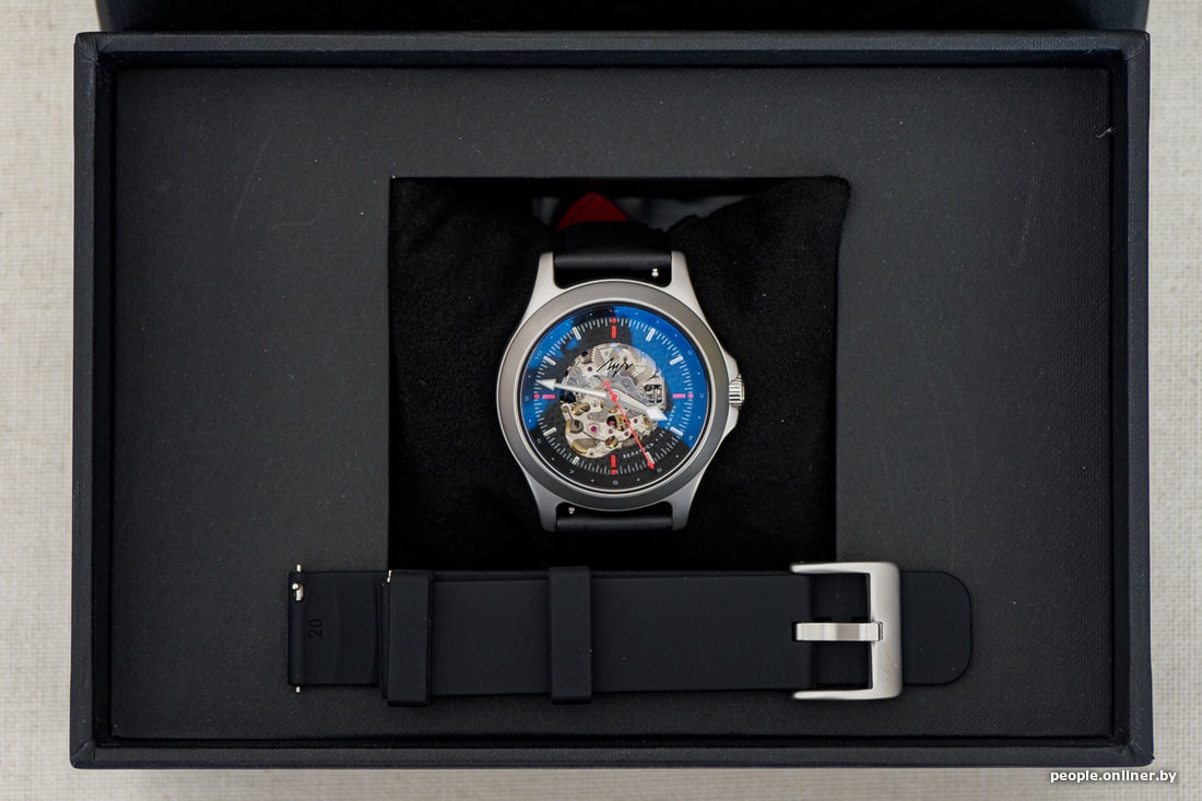 «Скелетон» — с механизмом Miyota, автоподзаводом, сапфировым стеклом, корпусом из титана. В комплекте со сменным ремнем — кожаный черный, с красной изнанкой.