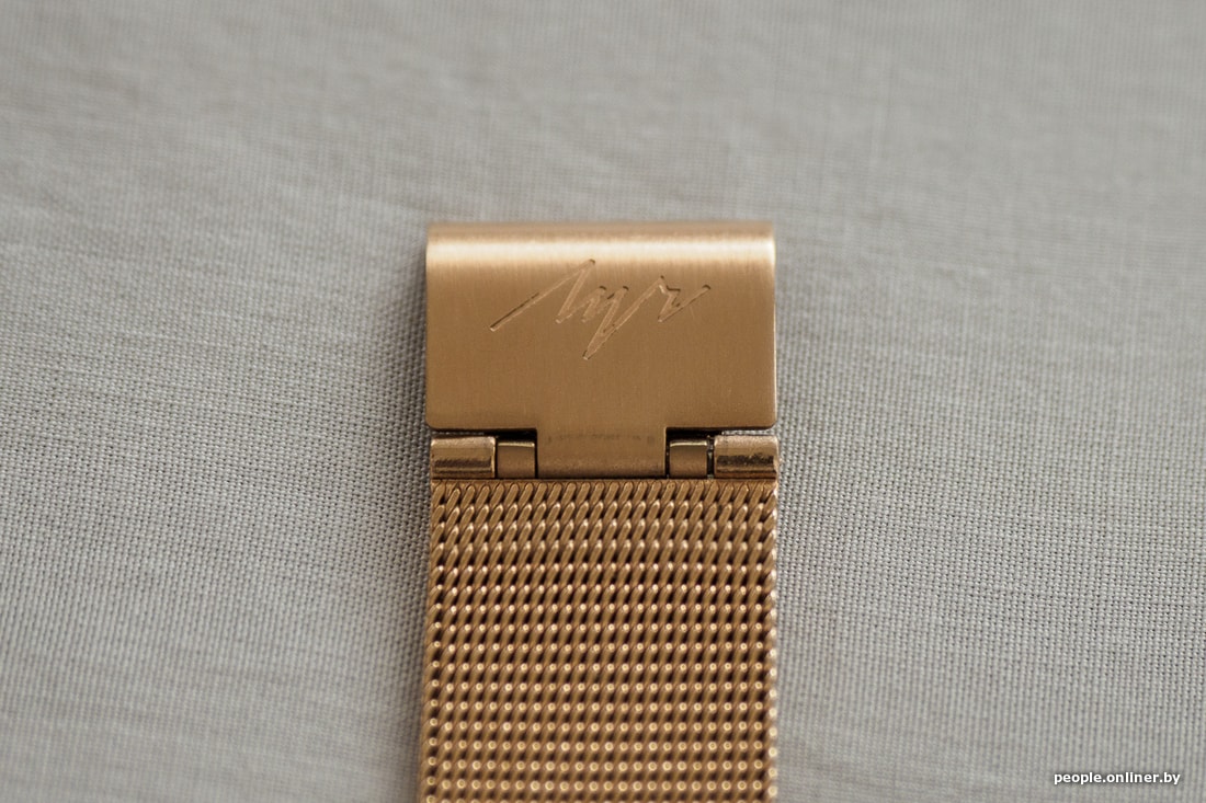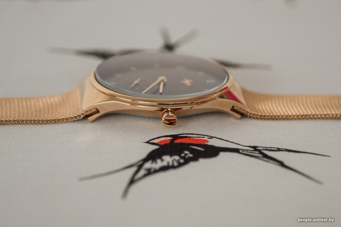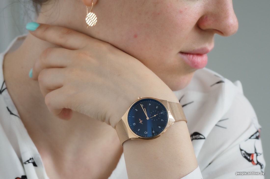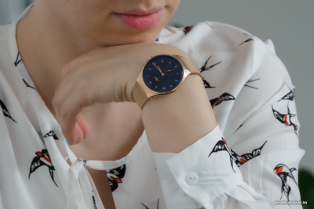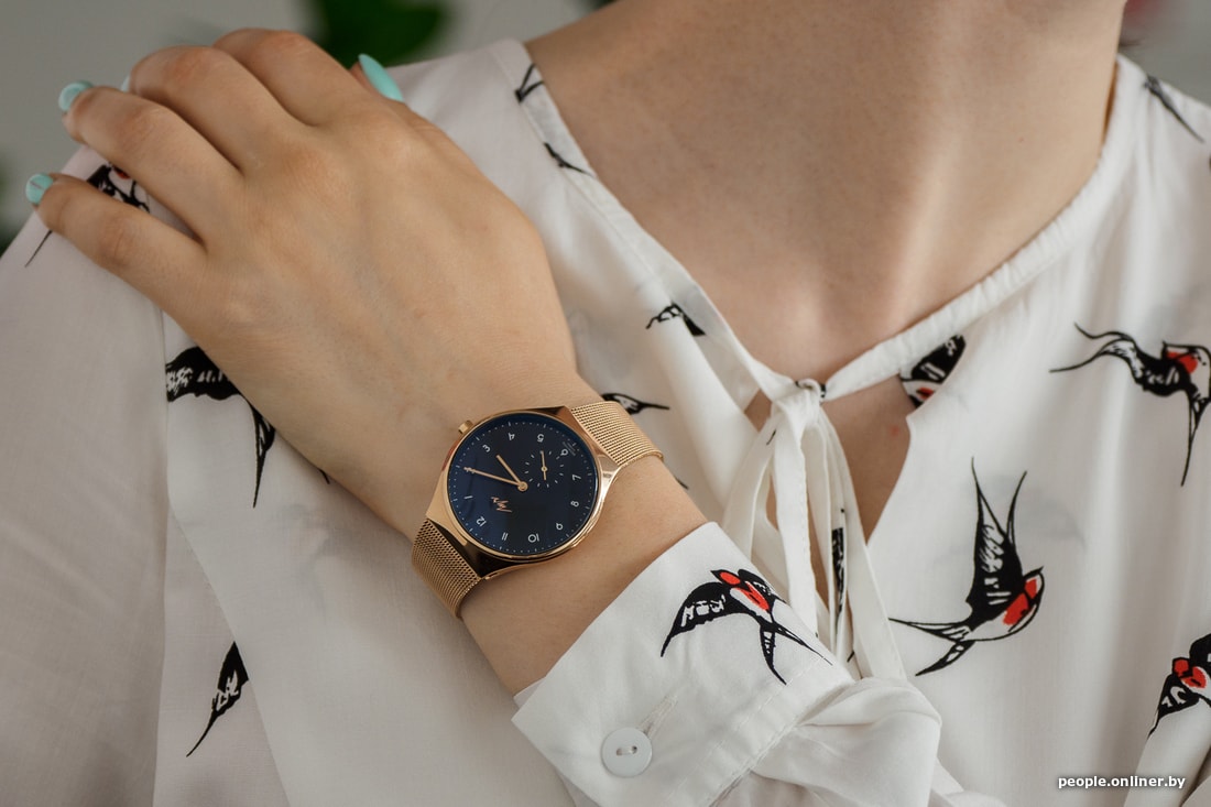 Механизм кварцевый, Miyota 1656M. Компания Miyota, кстати, была основана в 1981 году и является дочерней компанией одного из крупнейших концернов Citizen — одного из крупнейших производителей качественных японских часов. На циферблат нанесены арабские цифры. Индикация секунд и секундная стрелка вынесены отдельно. Замок раскладной, субъективно не самый удобный, но, возможно, это связано с недостаточной его подгонкой на тестовых экземплярах. Корпус выполнен из нержавеющей стали. Производитель заявляет водонепроницаемость в 3 бара. Это означает, что часы способны выдержать статическое давление 30-метрового водяного столба, но не означает, что в них можно нырять на глубину 30 метров. Линейка представлена в трех расцветках: серебристые часы с белым циферблатом, а также серебристые и цвета розового золота с синим фоном. Нарядные женские часы для разных поводов.