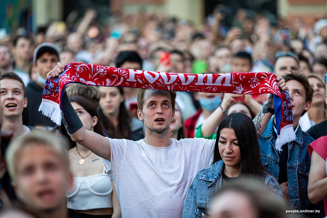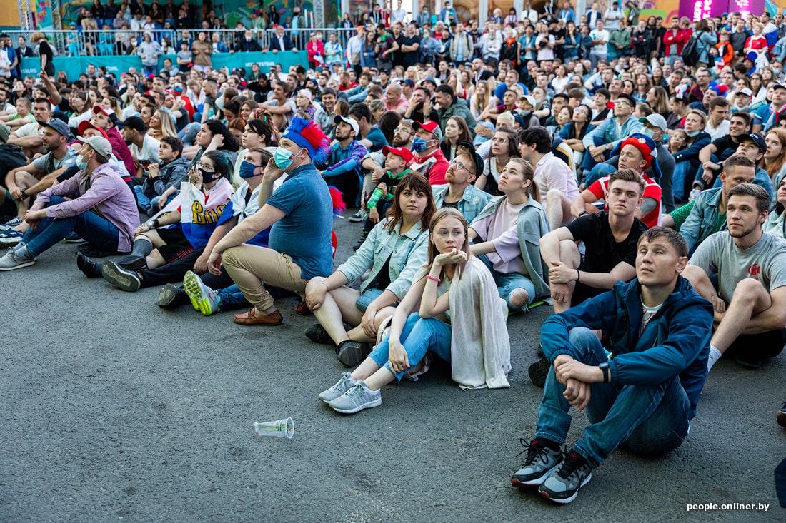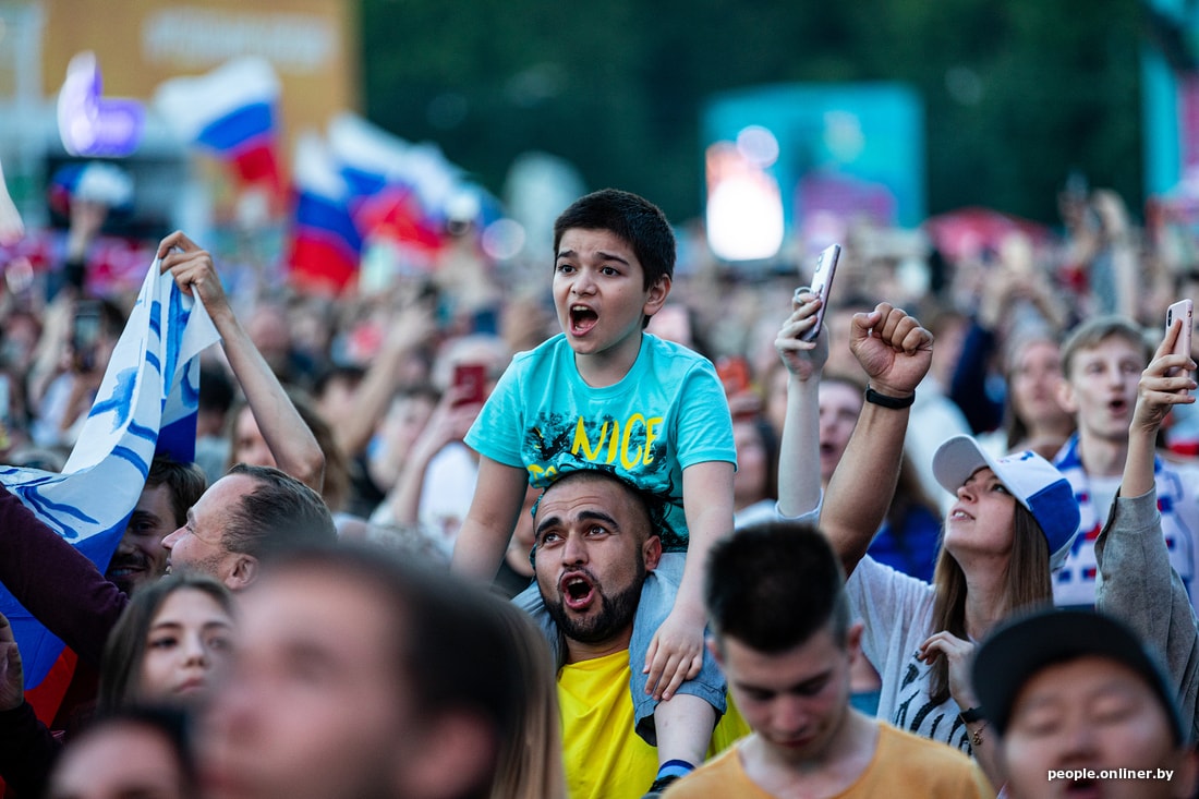 Прямо перед началом матча с бельгийцами на подступах к фан-зоне яблоку негде упасть. Выставлены дополнительные турникеты, людей, которые хотят попасть внутрь, отправляют в дикую очередь, которая не дает никаких шансов попасть к экрану до начала матча. Люди покорно ждут. А вдруг!