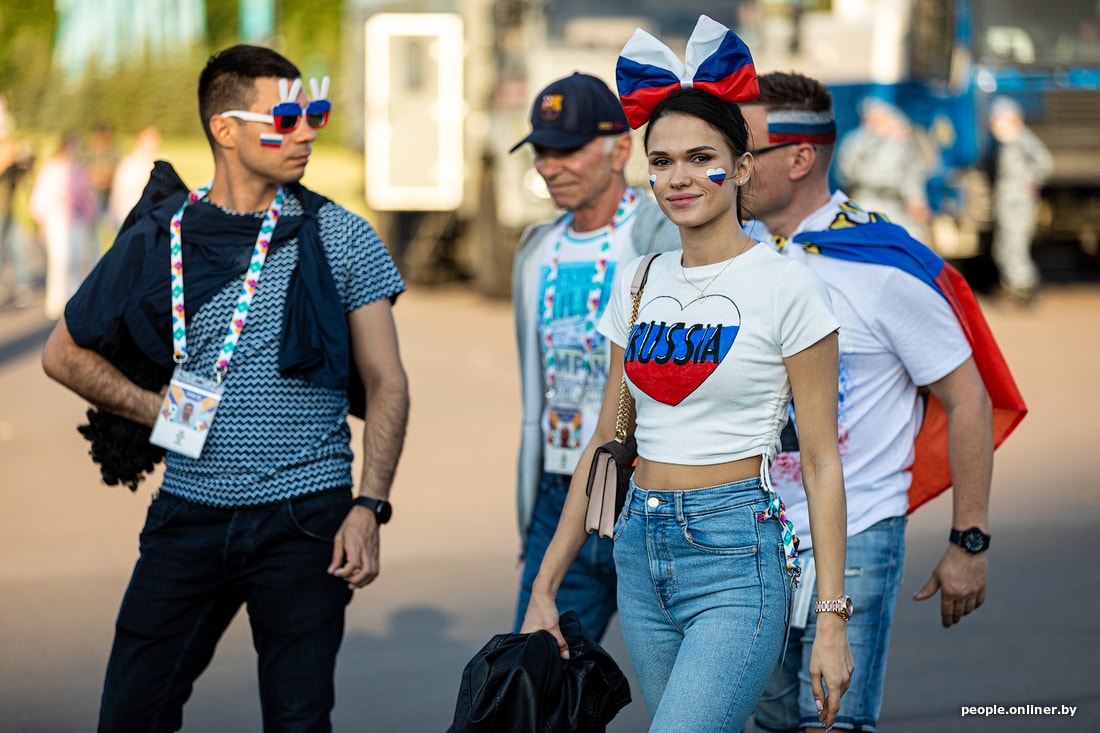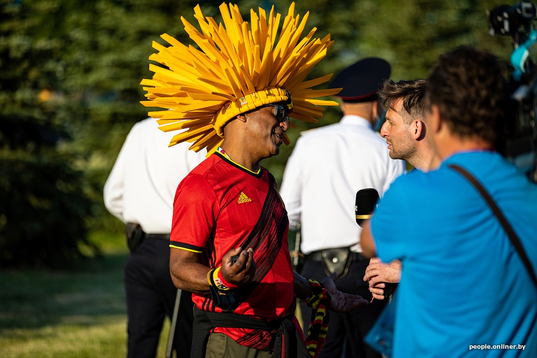 Через Приморский парк Победы большими компаниями к стадиону идут люди. Вокруг много палаток с едой и пивом, зоны активностей на любой вкус (можно попробовать забить гол в миниатюрные ворота или сфотографироваться на тематических площадках), и градус веселья постепенно выходит на нужный уровень. В толпе можно различить три большие группы — болельщиков-россиян, сотрудников полиции и бельгийцев. Последних меньше всего, и они сразу становятся чем-то вроде достопримечательности: к парням (девушек-болельщиц из Бельгии мы не увидели) бегут фотографироваться, весело общаются — в общем, просто радуются иностранцу, который по вполне объяснимым причинам сделался здесь редким гостем и теперь представляет собой экспонат, достойный Эрмитажа.