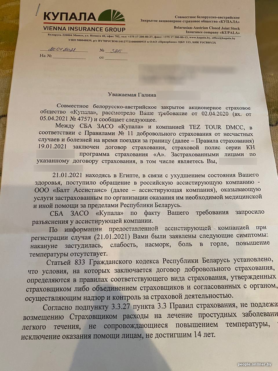 Из ответа «Купалы» Галине следует, что женщина в Египте общалась с российской ассистирующей компанией «Балт Ассистанс»: именно она предоставляла туристке услуги по организации оказания медпомощи.