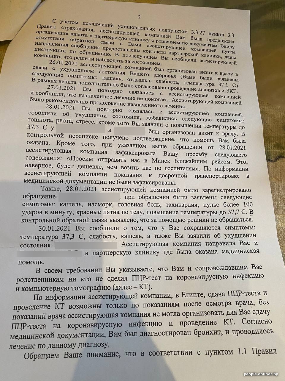 В страховой организации объяснили это так: в Египте сдача ПЦР-теста и проведение КТ возможны только по показаниям после осмотра врача, без показаний врача организовать это было невозможно. «Согласно медицинской документации, вам был диагностирован бронхит, и по данному диагнозу проводилось лечение», — отметили в «Купале».
