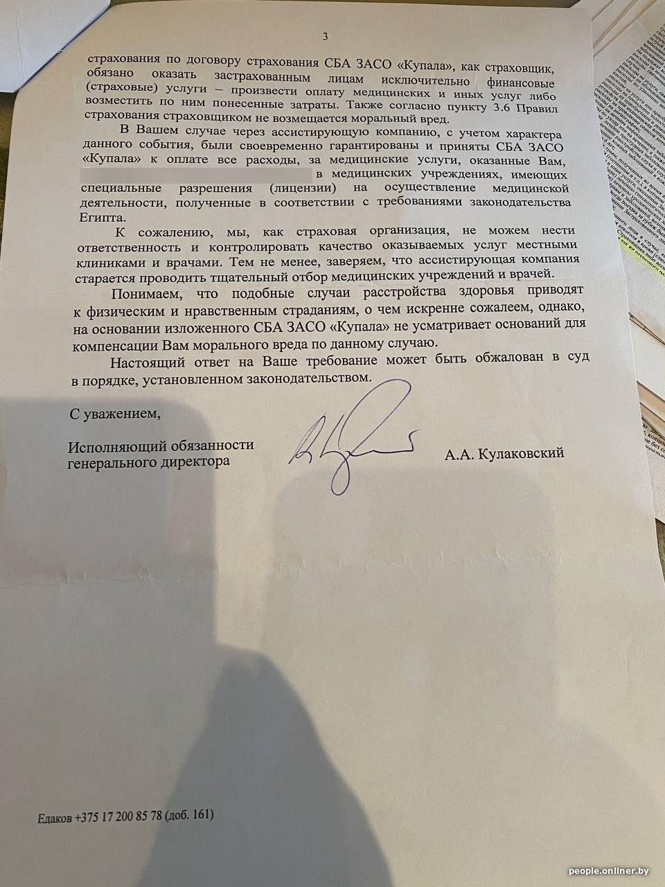 «К сожалению, мы, как страховая организация, не можем нести ответственность и контролировать качество услуг, оказываемых местными клиниками и врачами. Тем не менее заверяем, что ассистирующая компания старается проводить тщательный отбор медицинских учреждений и врачей. Понимаем, что подобные случаи расстройства здоровья приводят к физическим и нравственным страданиям, о чем искренне сожалеем, однако на основании изложенного „Купала“ не усматривает оснований для компенсации вам морального вреда по данному случаю», — таков был ответ.