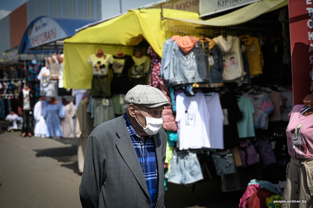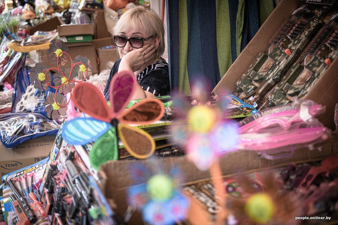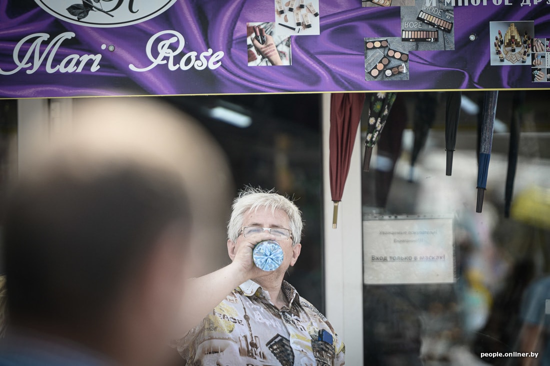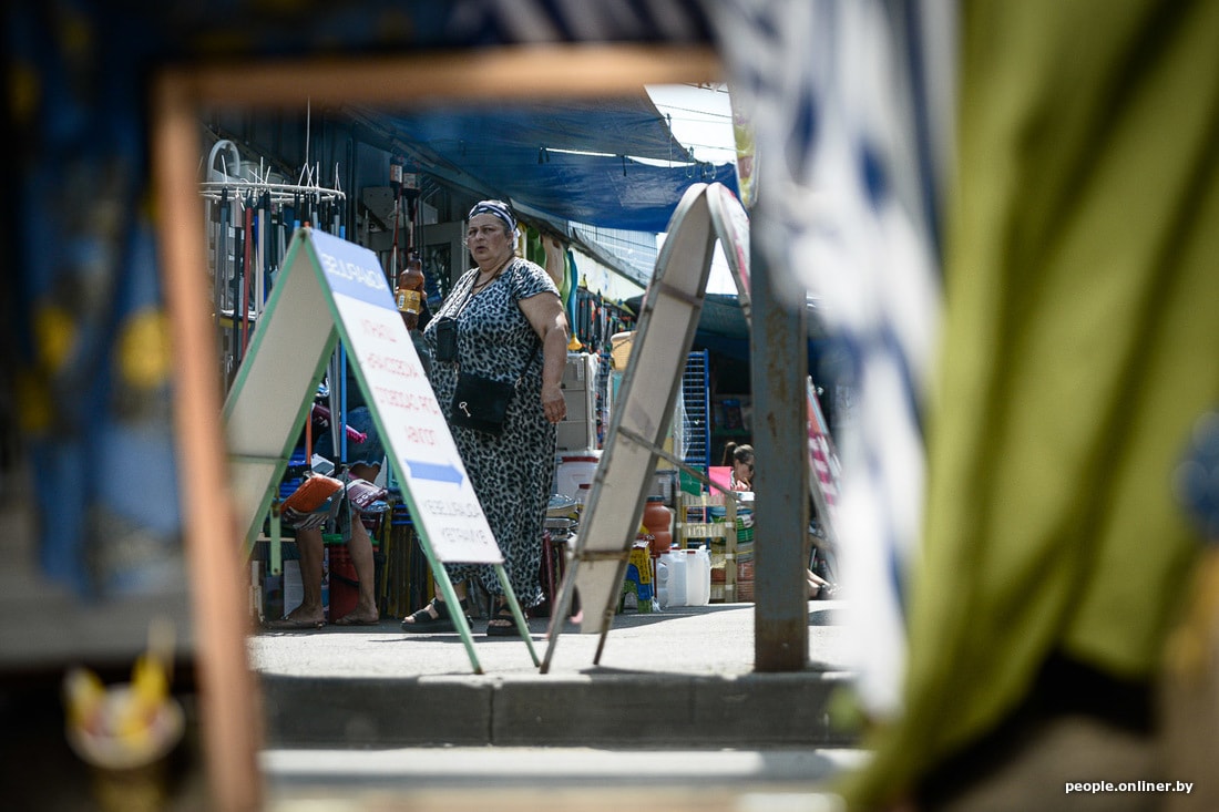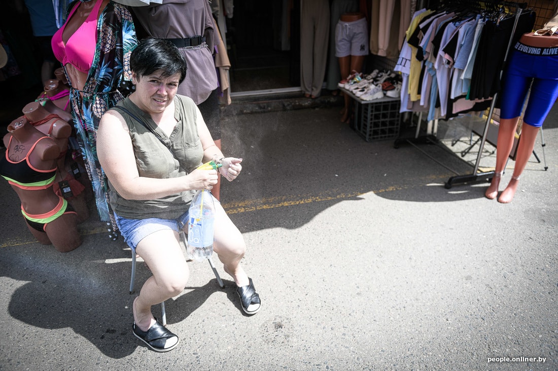 — Очень плохо работается, вот домой сейчас поеду — и в душ сразу! Людей нет, все на Цнянке и Минском море, наверное. Если были бы продажи — никто бы не собирался. Некоторые продавцы вообще не выходят, только в выходные. А то в будние дни пришел, позагорал, попарился, ушел, — восклицает женщина. — Вот видите лужи — это мы обрызгиваем друг друга и под тентами прячемся. Каждое утро их [тенты] собираем, пока откроешься, пару раз вспотеешь, ну а что делать?