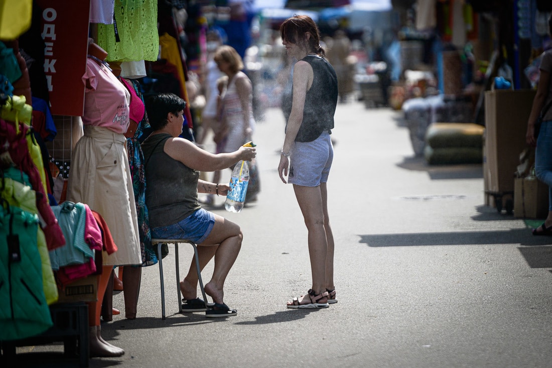 От жары спасаются по-простому: в основном это опрыскивание себя из пульверизатора, главное, чтоб вода была холодной и прицел настроен. На погоду тут жалуются не так сильно, как на отсутствие клиентов, хотя о последнем говорят в любую пору.