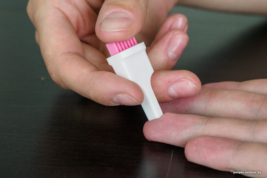 Пустить кровь самому себе рука не поднимается, помогают коллеги. Не жалеют. Иголка стреляет, ощущения того, что пальцу нанесен какой-то урон, нет вообще. Быстро, незаметно и безболезненно. Респект. Правда, крови из такой ранки маловато, но мы наскребли, причем буквально, так как в соломку кровь не идет, а вот плоскостью на ее конце можно пользоваться как ложкой.