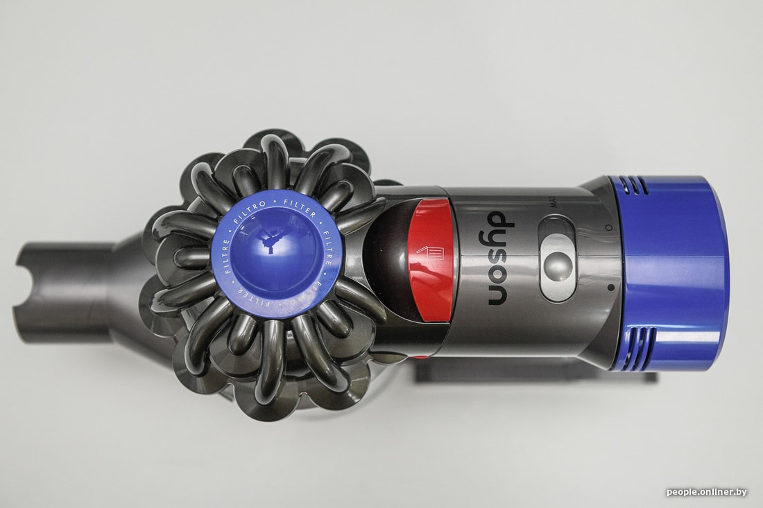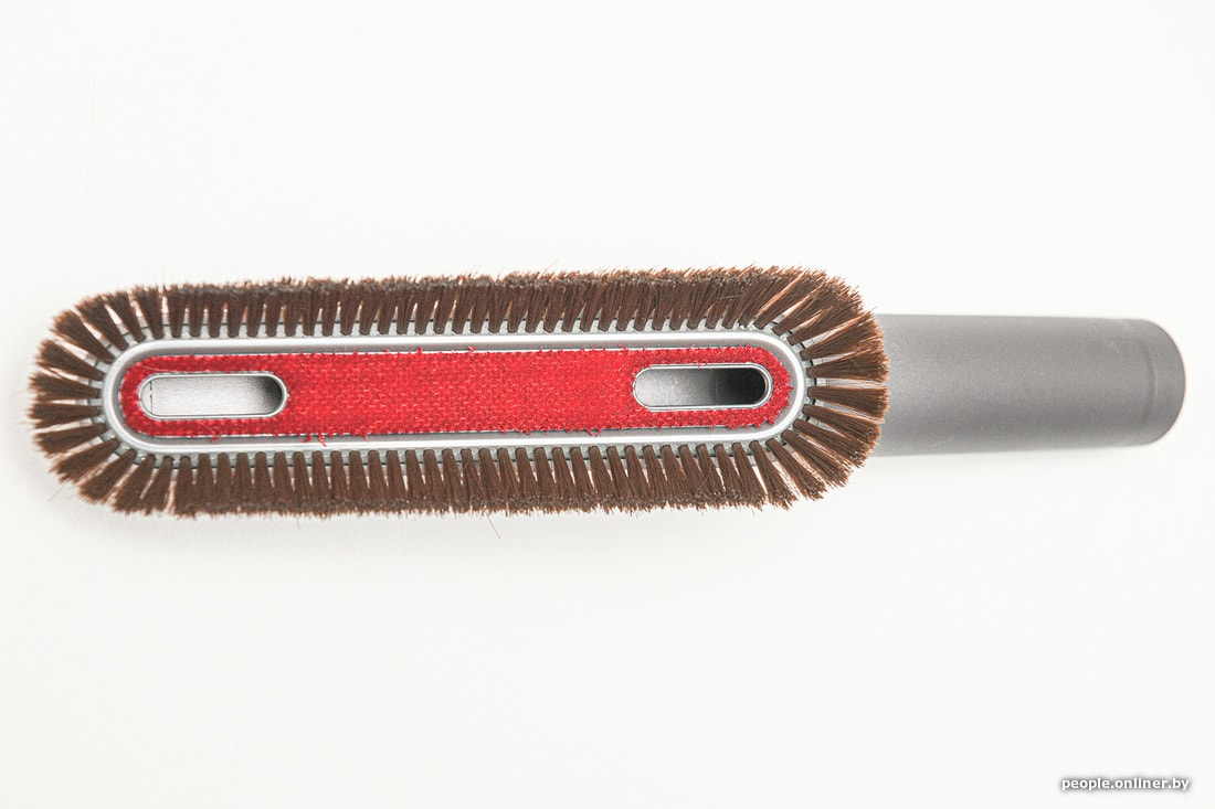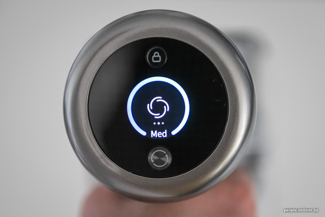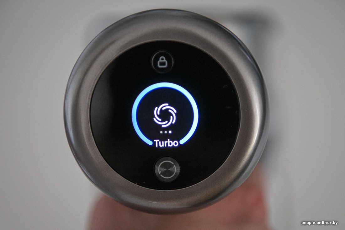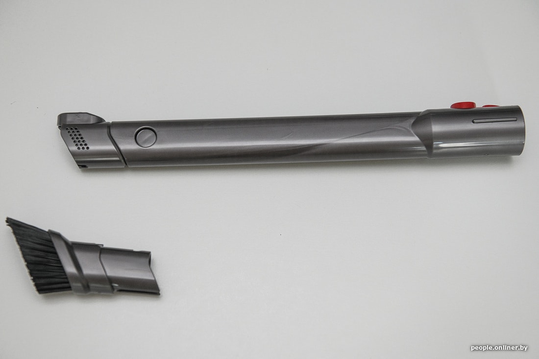 Ну и наконец, Dyson. Встречают, как известно, по одежке, и тут все значительно беднее, чем в моделях выше. Экрана нет. Индикация простейшая, светодиодная, да и режима мощности всего два. Курок не фиксируется. Плохо ли это? Мнения разделились, далеко не все коллеги посчитали эту опцию важной. Настенный держатель функции зарядки не имеет. Но и без плюсов, естественно, не обошлось: насадок в комплекте много и на любой вкус. Основная щетка показалась более сложной по исполнению и будто бы более продуманной, чем просто гибкий механизм в моделях выше. Контейнер опустошается сразу после того, как вы потянете за специальный рычаг, который расположен сверху на корпусе. Батарея несъемная. Все чересчур просто и без излишеств? Возможно, и так. Но выводы пока делать рано: дождемся финальных результатов теста.