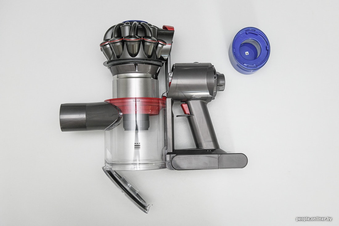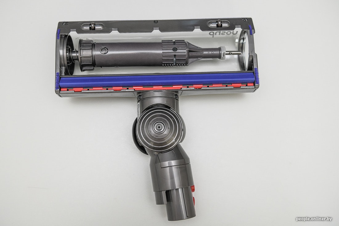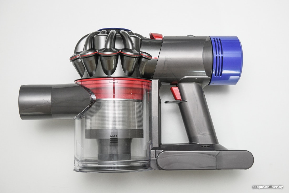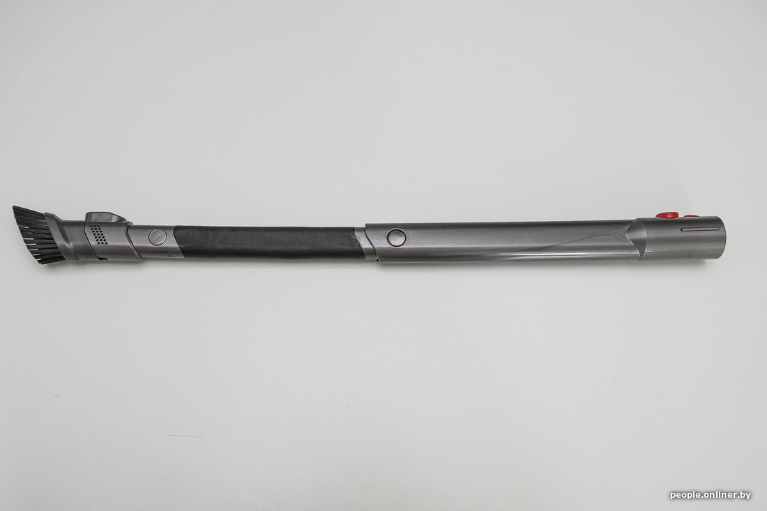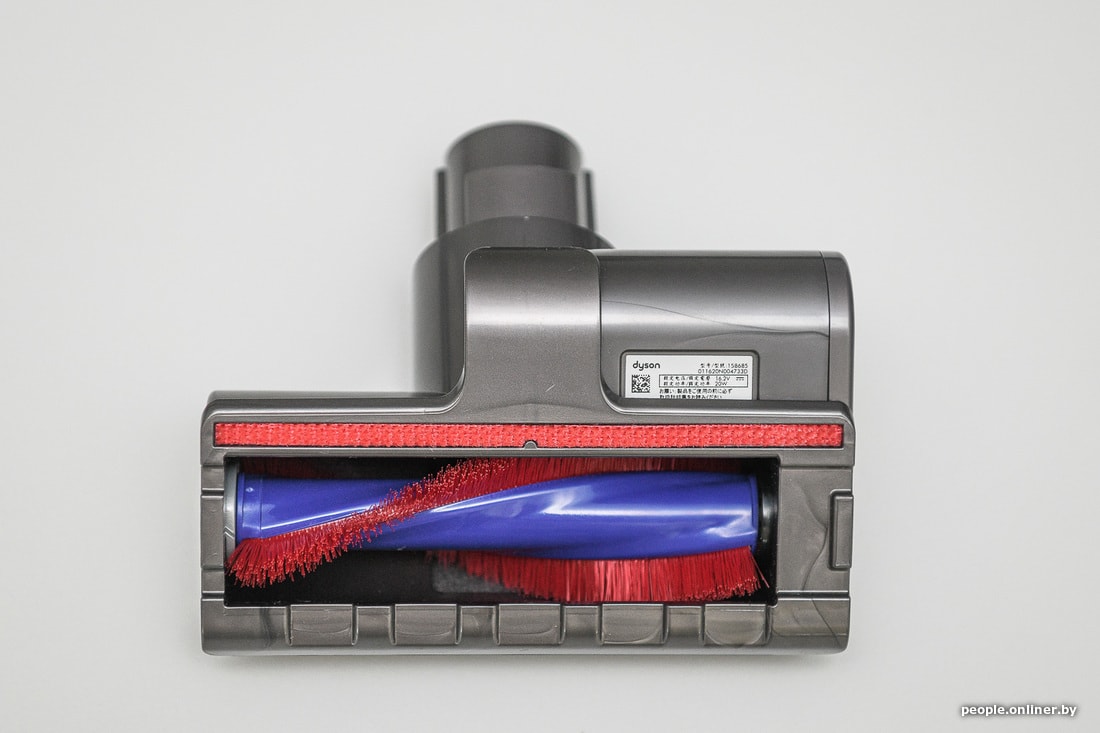 Ну и наконец, Dyson. Встречают, как известно, по одежке, и тут все значительно беднее, чем в моделях выше. Экрана нет. Индикация простейшая, светодиодная, да и режима мощности всего два. Курок не фиксируется. Плохо ли это? Мнения разделились, далеко не все коллеги посчитали эту опцию важной. Настенный держатель функции зарядки не имеет. Но и без плюсов, естественно, не обошлось: насадок в комплекте много и на любой вкус. Основная щетка показалась более сложной по исполнению и будто бы более продуманной, чем просто гибкий механизм в моделях выше. Контейнер опустошается сразу после того, как вы потянете за специальный рычаг, который расположен сверху на корпусе. Батарея несъемная. Все чересчур просто и без излишеств? Возможно, и так. Но выводы пока делать рано: дождемся финальных результатов теста.