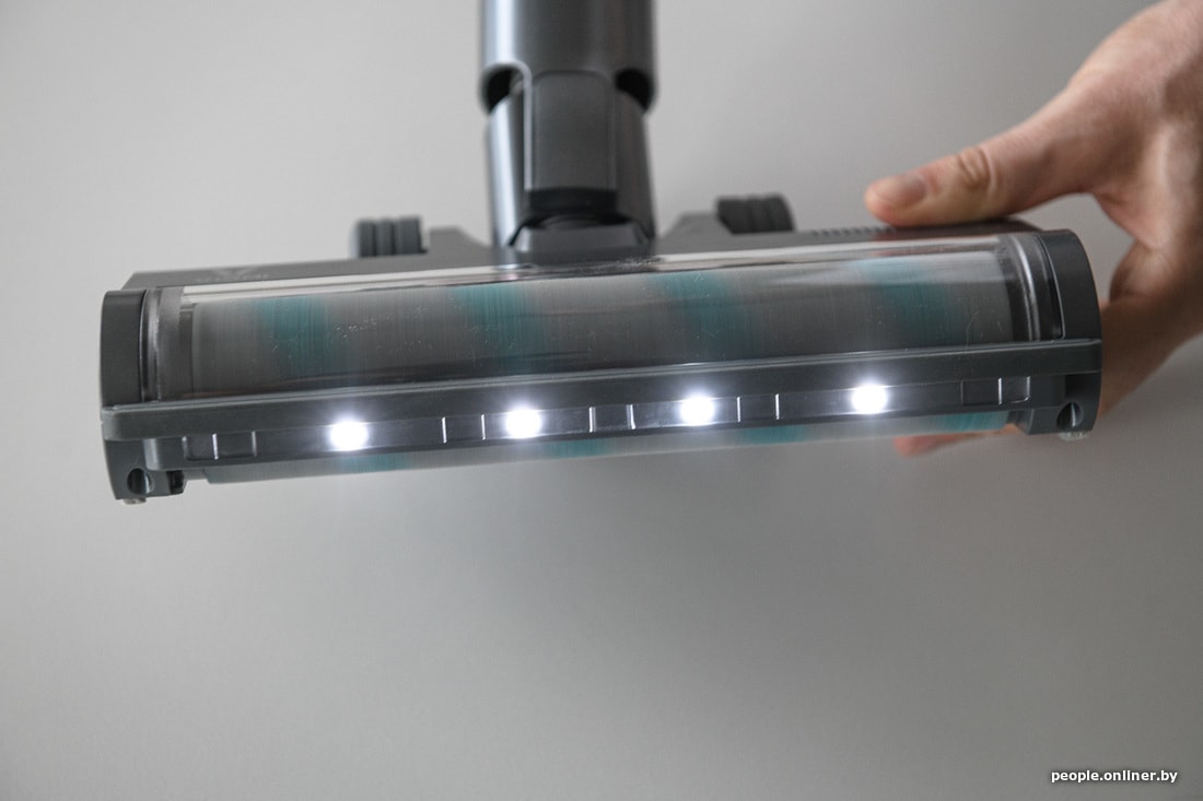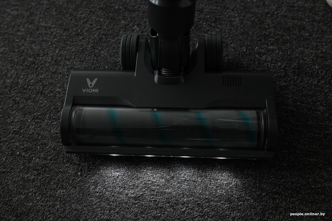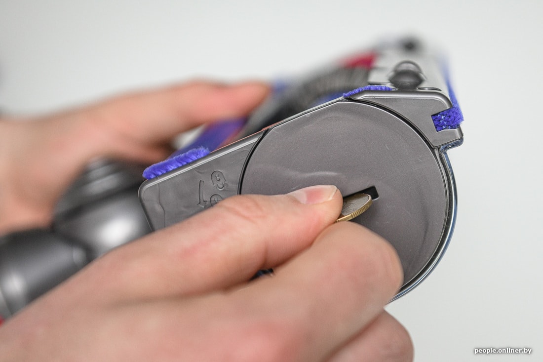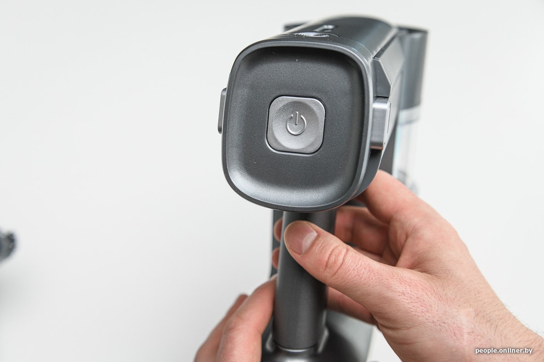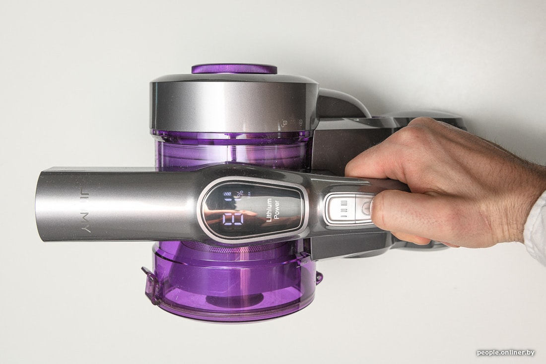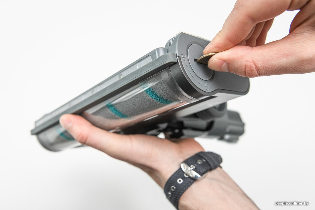 Следующий на очереди Viomi. Управление полностью механическое. Включение и смена режимов осуществляются с помощью кнопки на торце корпуса, курок отсутствует. Управлять одной рукой не получится: для смены режима во время уборки придется подключать вторую. Порадовала подсветка электрощетки. Это удобно в местах, где пыль и мусор плохо видны: например, под мебелью и в темных углах. Увы, подсветка неотключаемая, что, конечно же, влияет на время работы. Мощность всасывания регулируется в три ступени. Щетка, как и в модели выше, маневренная, поворачивается почти на 90 градусов в обе стороны. Важная особенность — это возможность снять аккумулятор и зарядить его в любом удобном месте, вне зависимости от того, где хранится пылесос. Индикатор заряда простой, светодиодный, на 5 делений. Мусор из контейнера высыпается снизу, после нажатия на кнопку. Чтобы очистить валик щетки, его необходимо снять. Без подручных средств не обойтись, в нашем случае пригодилась 50-копеечная монета.