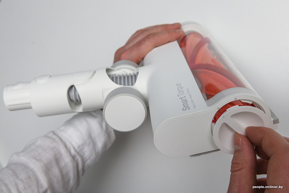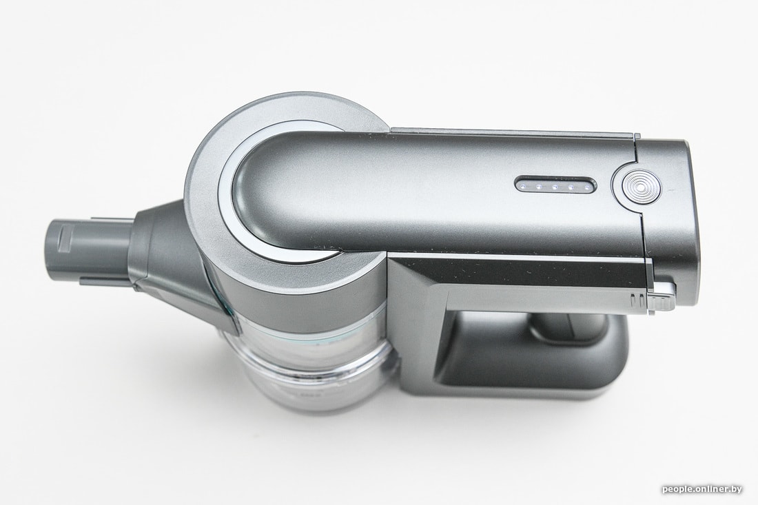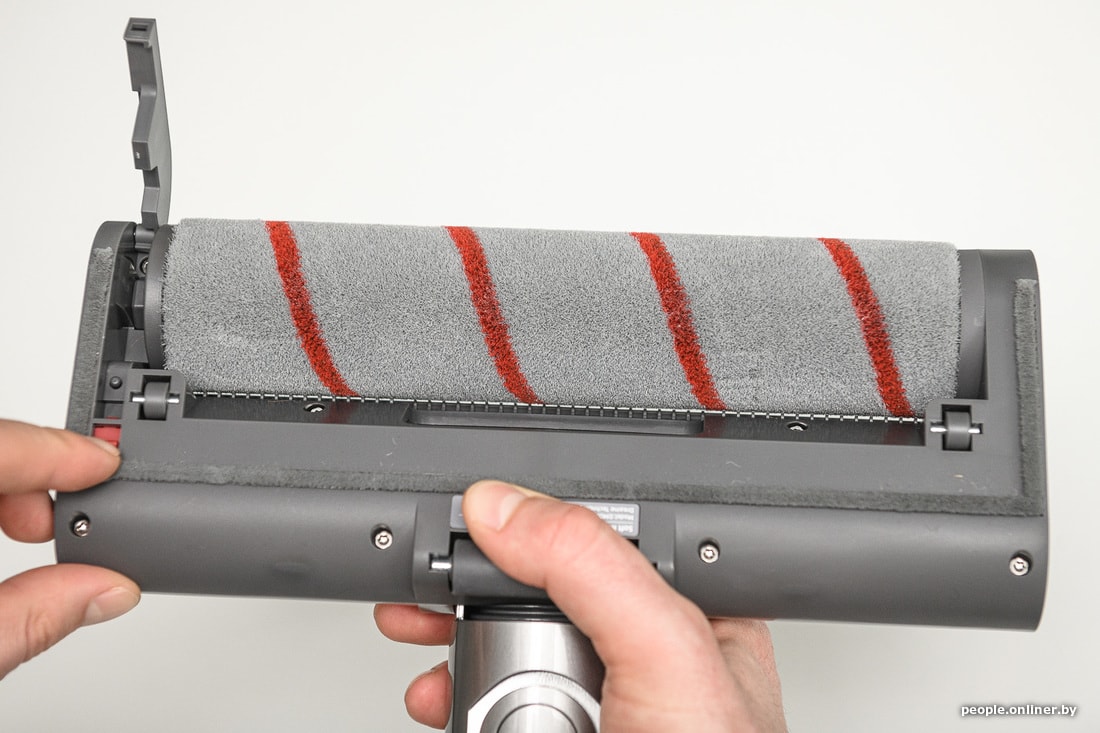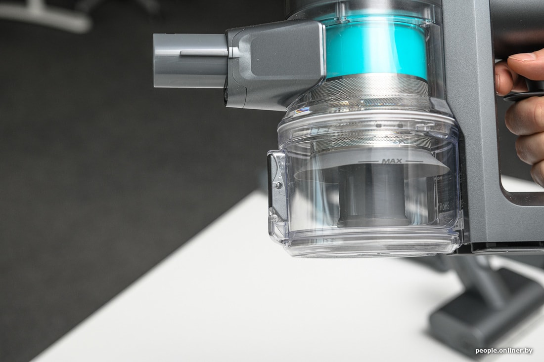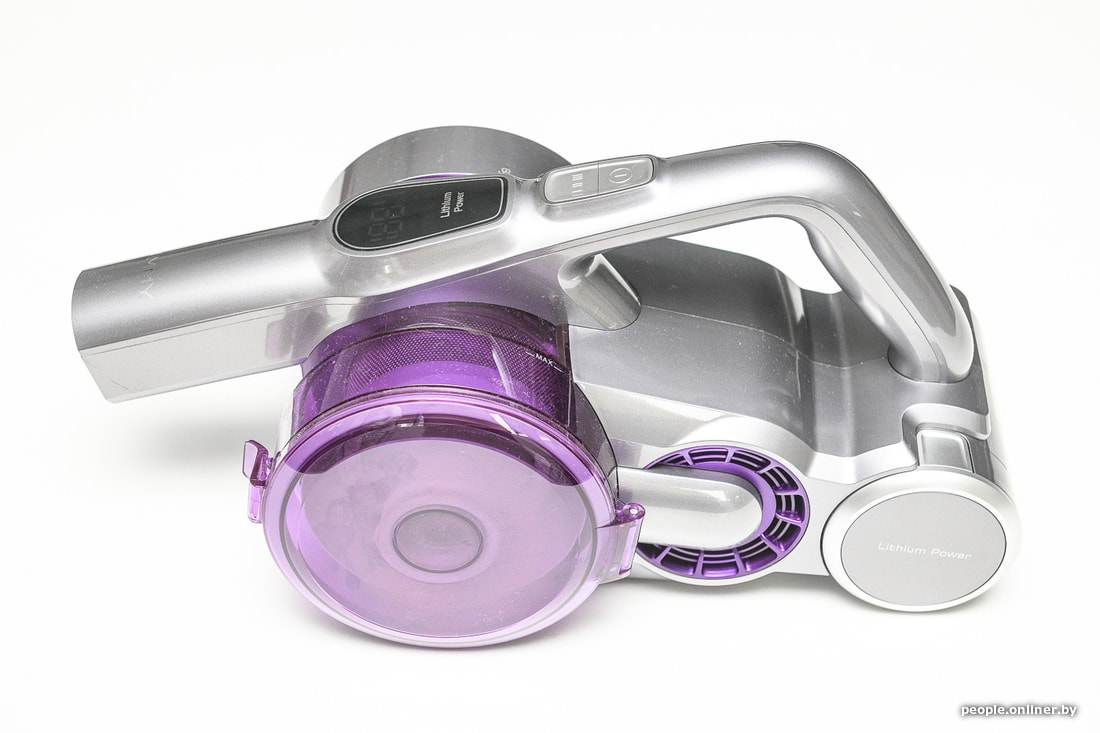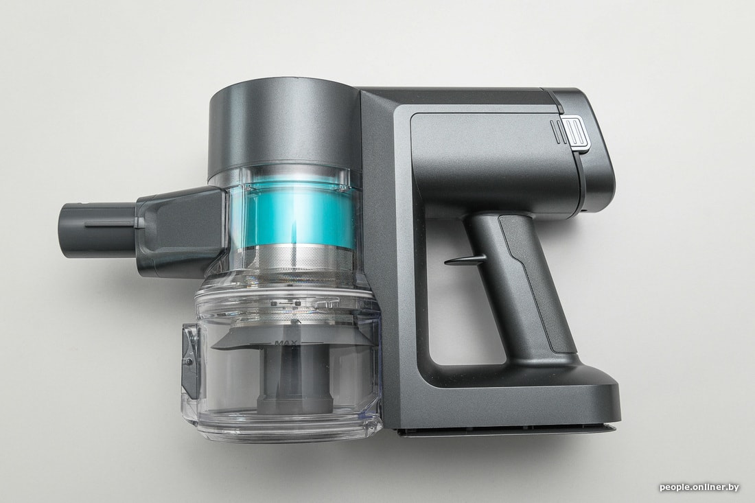Следующий на очереди Viomi. Управление полностью механическое. Включение и смена режимов осуществляются с помощью кнопки на торце корпуса, курок отсутствует. Управлять одной рукой не получится: для смены режима во время уборки придется подключать вторую. Порадовала подсветка электрощетки. Это удобно в местах, где пыль и мусор плохо видны: например, под мебелью и в темных углах. Увы, подсветка неотключаемая, что, конечно же, влияет на время работы. Мощность всасывания регулируется в три ступени. Щетка, как и в модели выше, маневренная, поворачивается почти на 90 градусов в обе стороны. Важная особенность — это возможность снять аккумулятор и зарядить его в любом удобном месте, вне зависимости от того, где хранится пылесос. Индикатор заряда простой, светодиодный, на 5 делений. Мусор из контейнера высыпается снизу, после нажатия на кнопку. Чтобы очистить валик щетки, его необходимо снять. Без подручных средств не обойтись, в нашем случае пригодилась 50-копеечная монета.