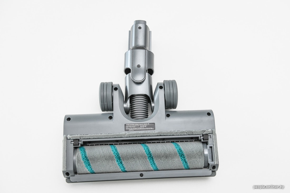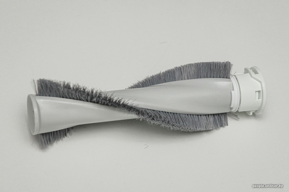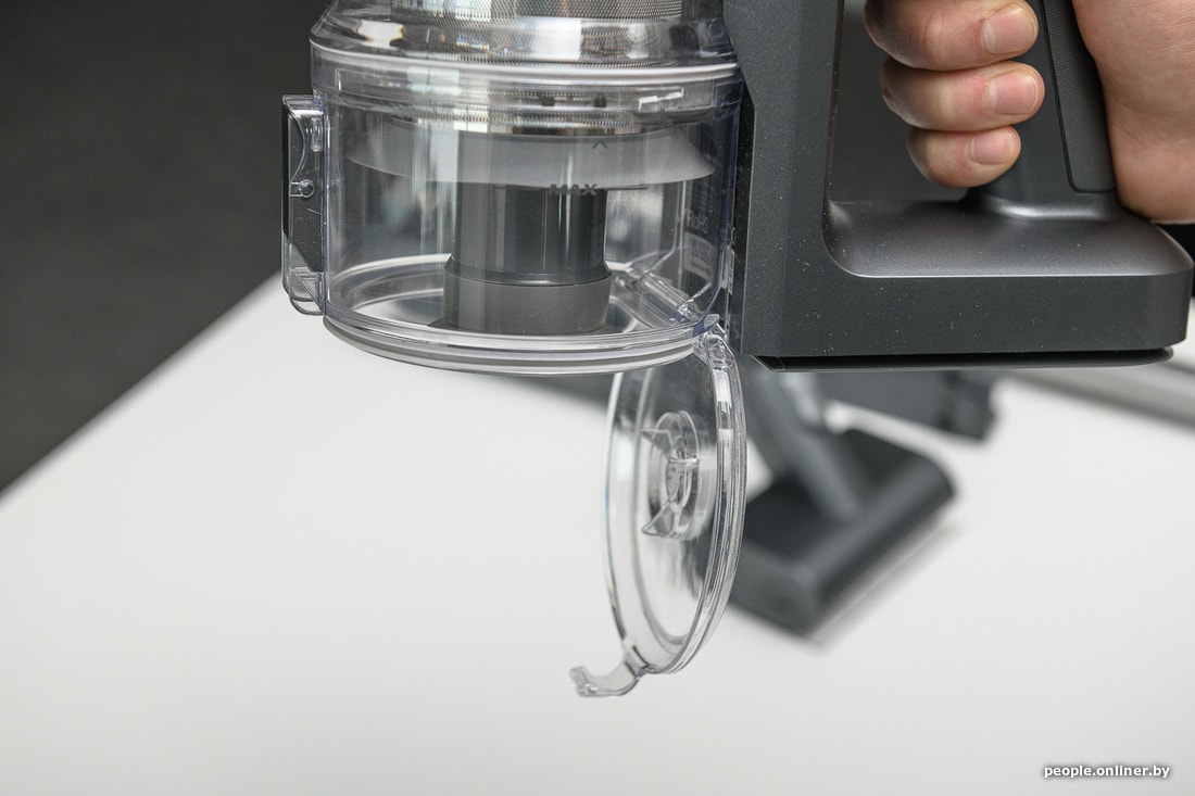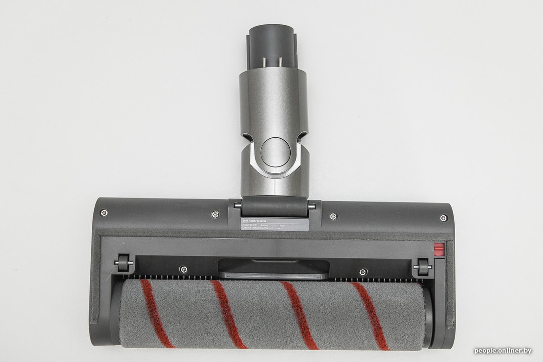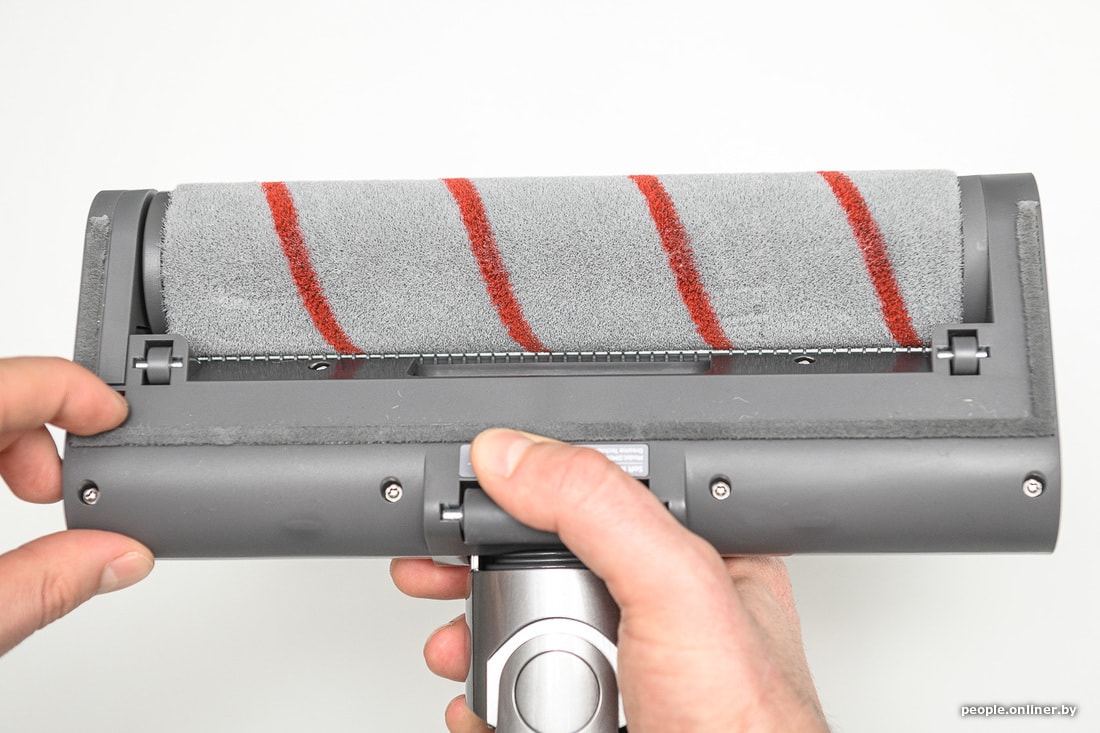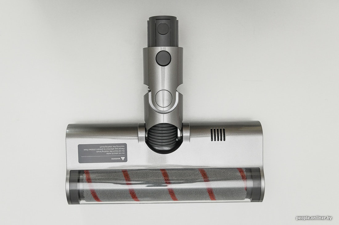 Следующий на очереди Viomi. Управление полностью механическое. Включение и смена режимов осуществляются с помощью кнопки на торце корпуса, курок отсутствует. Управлять одной рукой не получится: для смены режима во время уборки придется подключать вторую. Порадовала подсветка электрощетки. Это удобно в местах, где пыль и мусор плохо видны: например, под мебелью и в темных углах. Увы, подсветка неотключаемая, что, конечно же, влияет на время работы. Мощность всасывания регулируется в три ступени. Щетка, как и в модели выше, маневренная, поворачивается почти на 90 градусов в обе стороны. Важная особенность — это возможность снять аккумулятор и зарядить его в любом удобном месте, вне зависимости от того, где хранится пылесос. Индикатор заряда простой, светодиодный, на 5 делений. Мусор из контейнера высыпается снизу, после нажатия на кнопку. Чтобы очистить валик щетки, его необходимо снять. Без подручных средств не обойтись, в нашем случае пригодилась 50-копеечная монета.