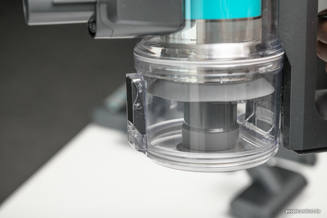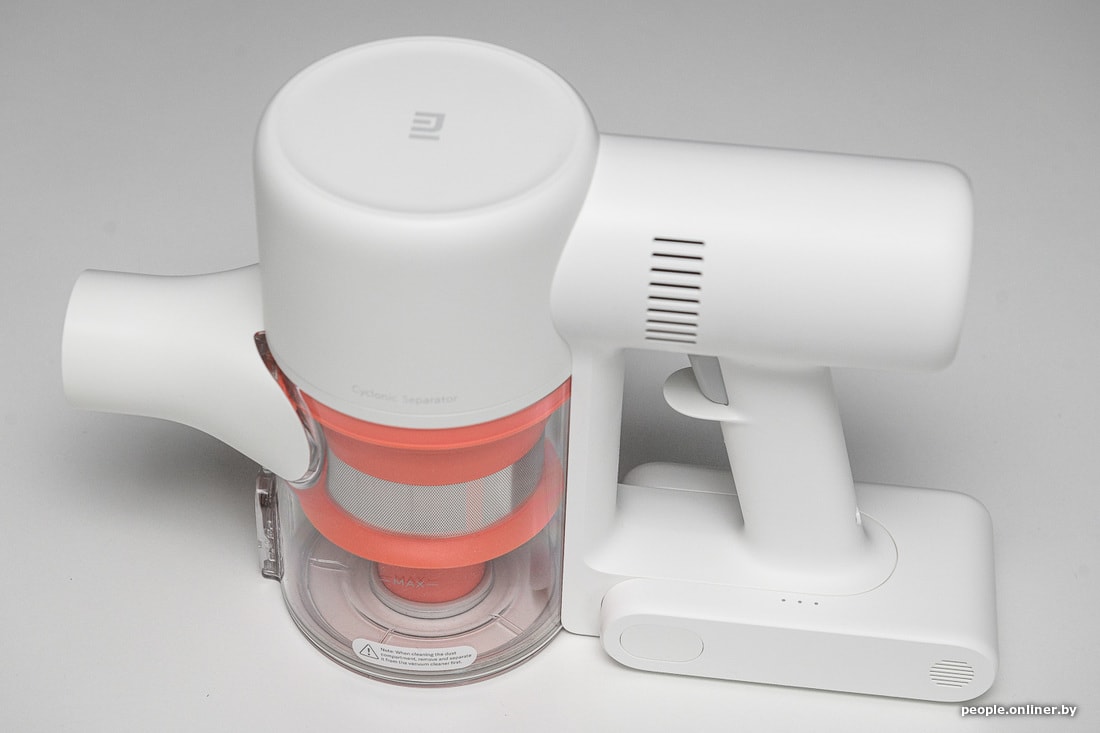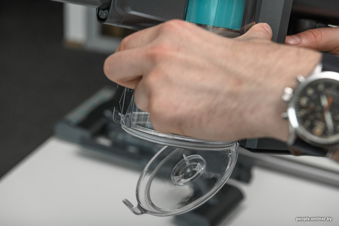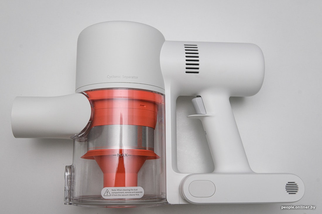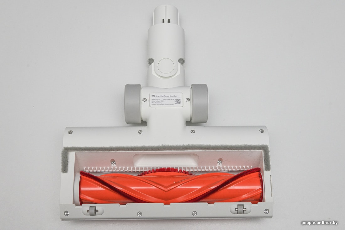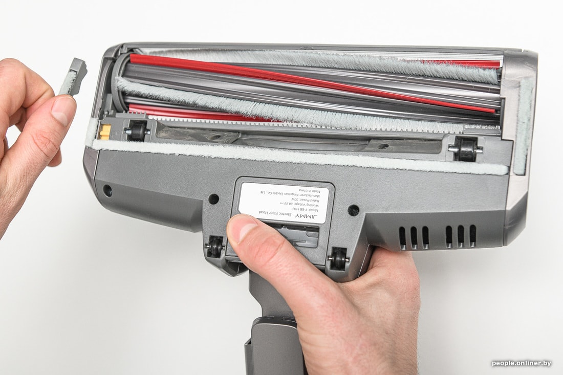 Следующий на очереди Viomi. Управление полностью механическое. Включение и смена режимов осуществляются с помощью кнопки на торце корпуса, курок отсутствует. Управлять одной рукой не получится: для смены режима во время уборки придется подключать вторую. Порадовала подсветка электрощетки. Это удобно в местах, где пыль и мусор плохо видны: например, под мебелью и в темных углах. Увы, подсветка неотключаемая, что, конечно же, влияет на время работы. Мощность всасывания регулируется в три ступени. Щетка, как и в модели выше, маневренная, поворачивается почти на 90 градусов в обе стороны. Важная особенность — это возможность снять аккумулятор и зарядить его в любом удобном месте, вне зависимости от того, где хранится пылесос. Индикатор заряда простой, светодиодный, на 5 делений. Мусор из контейнера высыпается снизу, после нажатия на кнопку. Чтобы очистить валик щетки, его необходимо снять. Без подручных средств не обойтись, в нашем случае пригодилась 50-копеечная монета.
