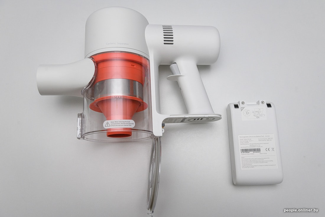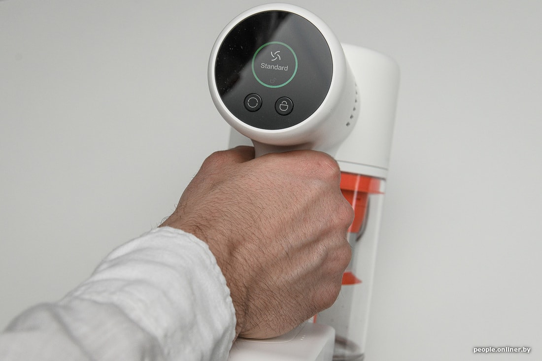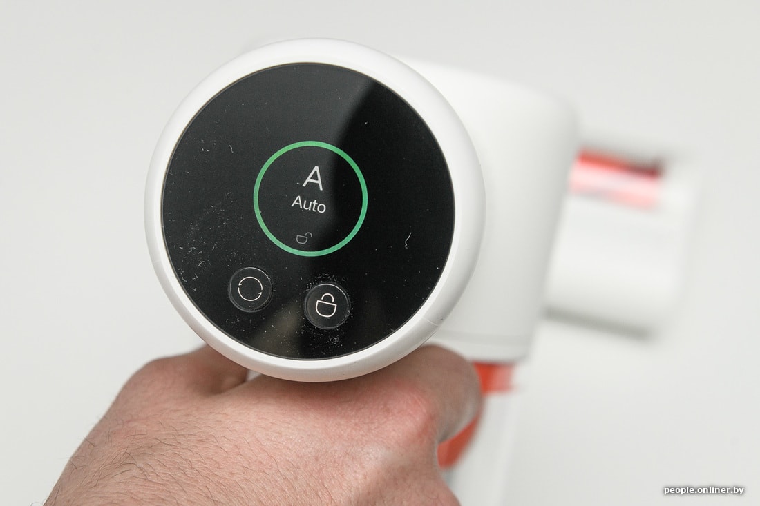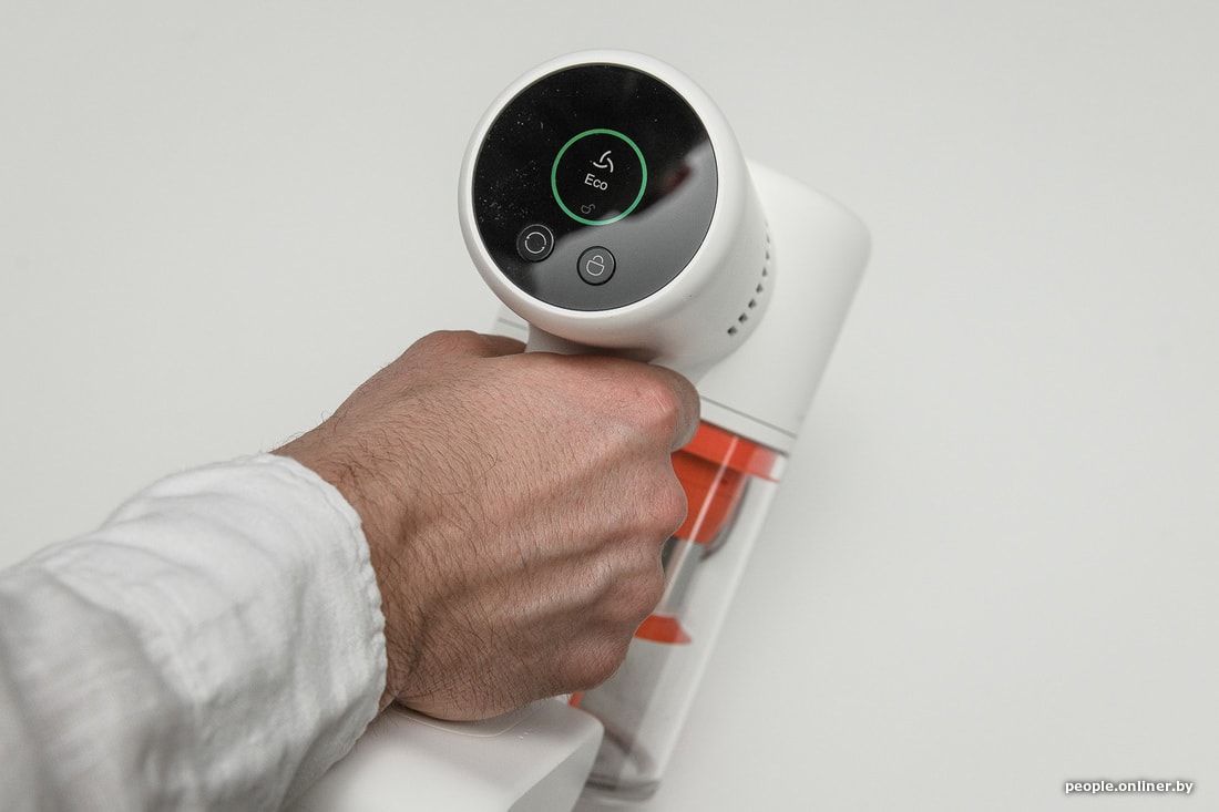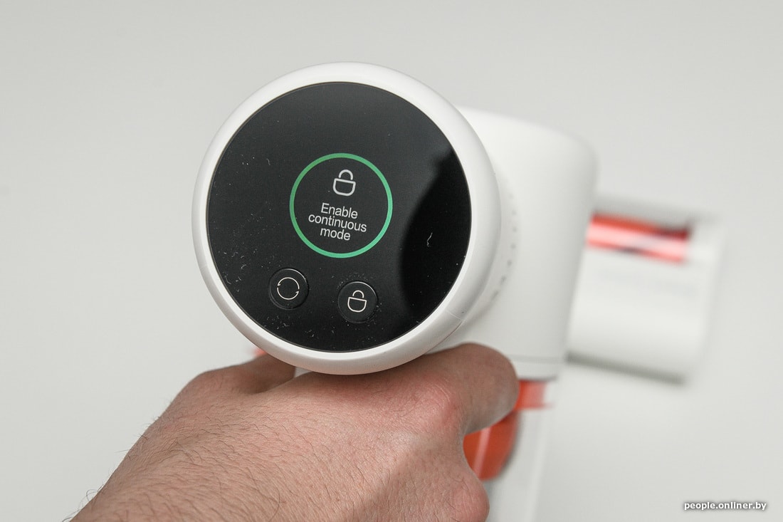 Xiaomi выделяется характерным матовым белым корпусом и ярким цветным ЖК-экраном, на который можно тоже установить русский язык! В комплекте, как уже писали выше, есть контейнер для влажной уборки, а значит, пылесос еще и моющий. Управление механическое, курком, но нажатие можно зафиксировать. Режимы меняются кнопками под дисплеем. Индикатор заряда круговой и светодиодный на самом аккумуляторе. После детального изучения этикетки на корпусе выяснили, что контрактным производителем модели также является Dreame.