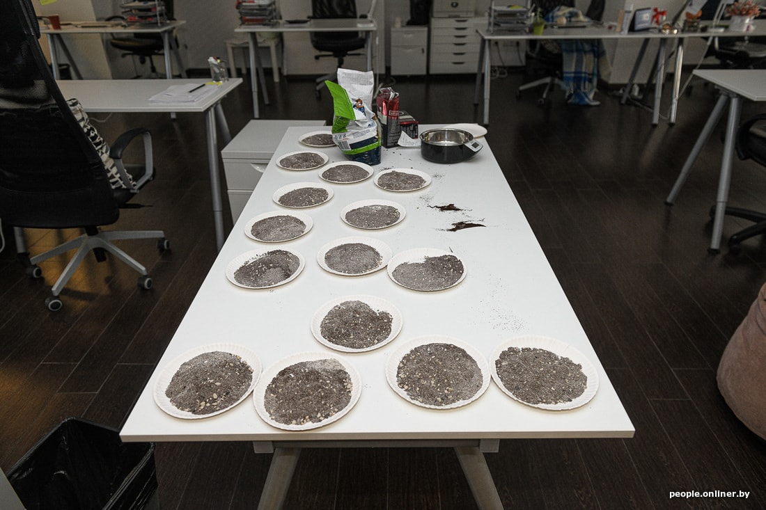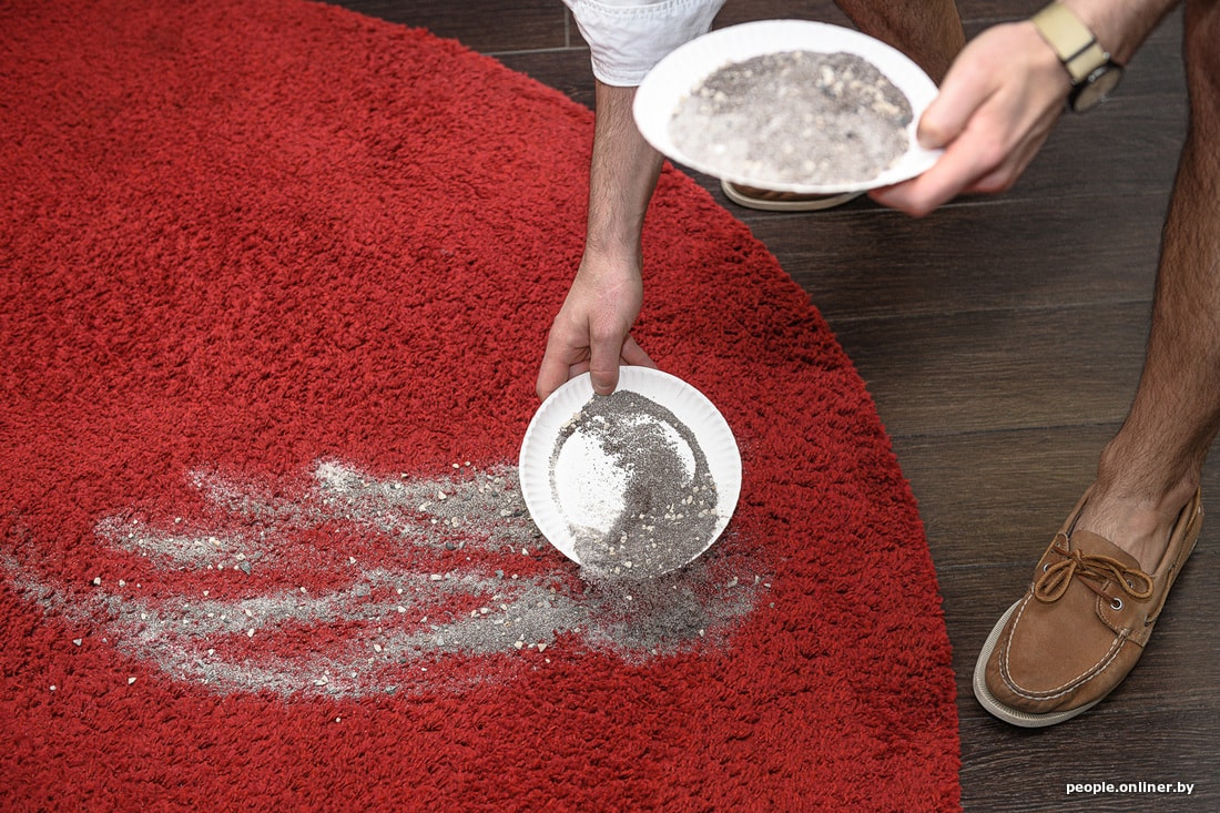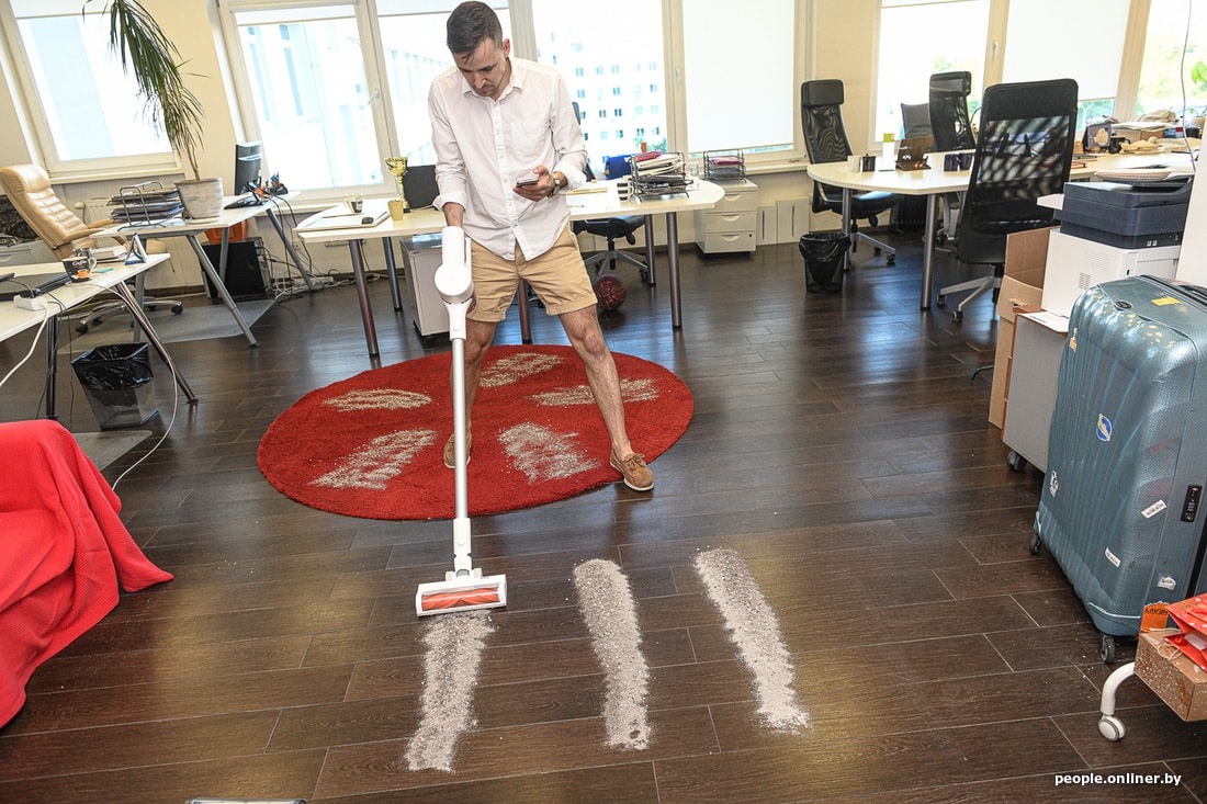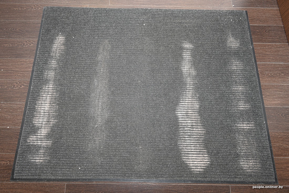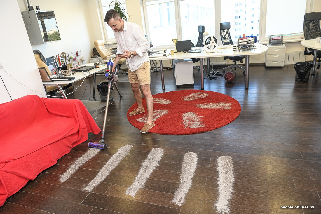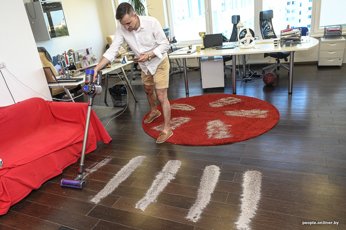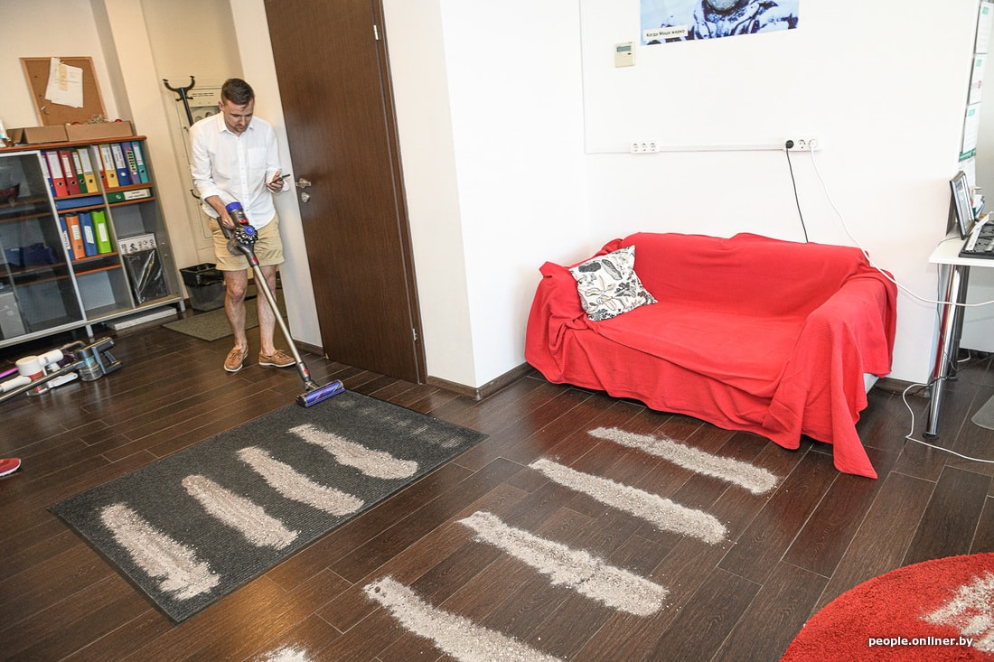 Итак, начинаем проверку боем. Для этого мы подготовили несколько тестов. О, да, мы действительно заморочились! Мы смешали в равных пропорциях муку, молотый кофе и кошачий наполнитель — 60 грамм суммарно — и разбросали это все на три разных покрытия: твердый пол с плиткой, ковролин и ковер с длинным ворсом. На каждую «дорожку» из мусора мы отводили одинаковый отрезок времени в 10 секунд. Ковролин и плитку мы пылесосили на стандартном режиме (автоматический на Xiaomi), для ковра запускали режим повышенной мощности. На фото ниже показываем, как выглядело одно из помещений нашего офиса до уборки.