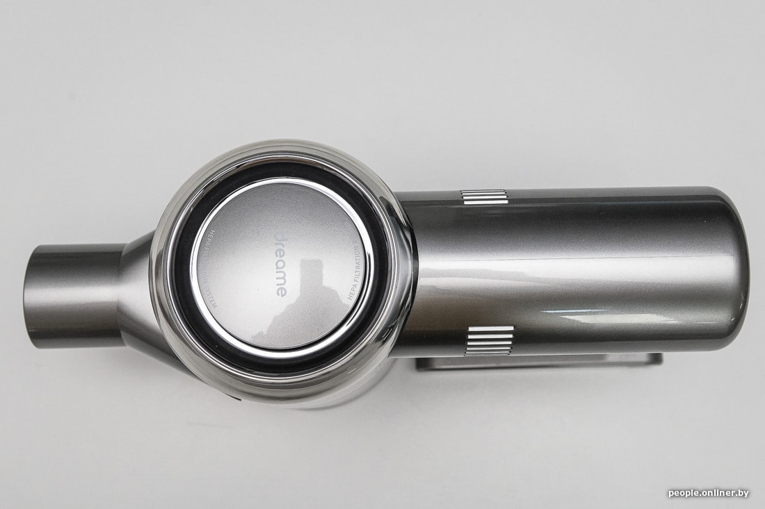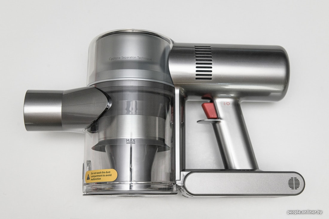 Как и в предыдущем пункте, начнем с Dreame. Пылесос имеет 3 уровня мощности. Модель запускается нажатием на специальную кнопку-курок, но держать ее постоянно не обязательно: режим фиксируется. Индикация светодиодная, на самом аккумуляторе, но есть также и ЖК-экран. На нем выводится выбранный режим работы и круговой индикатор уровня заряда батареи. Можно поставить русский язык. Стильно, модно, информативно. Аккумулятор у модели не снимается, по крайней мере без инструментов. Настенное крепление поддерживает зарядку.