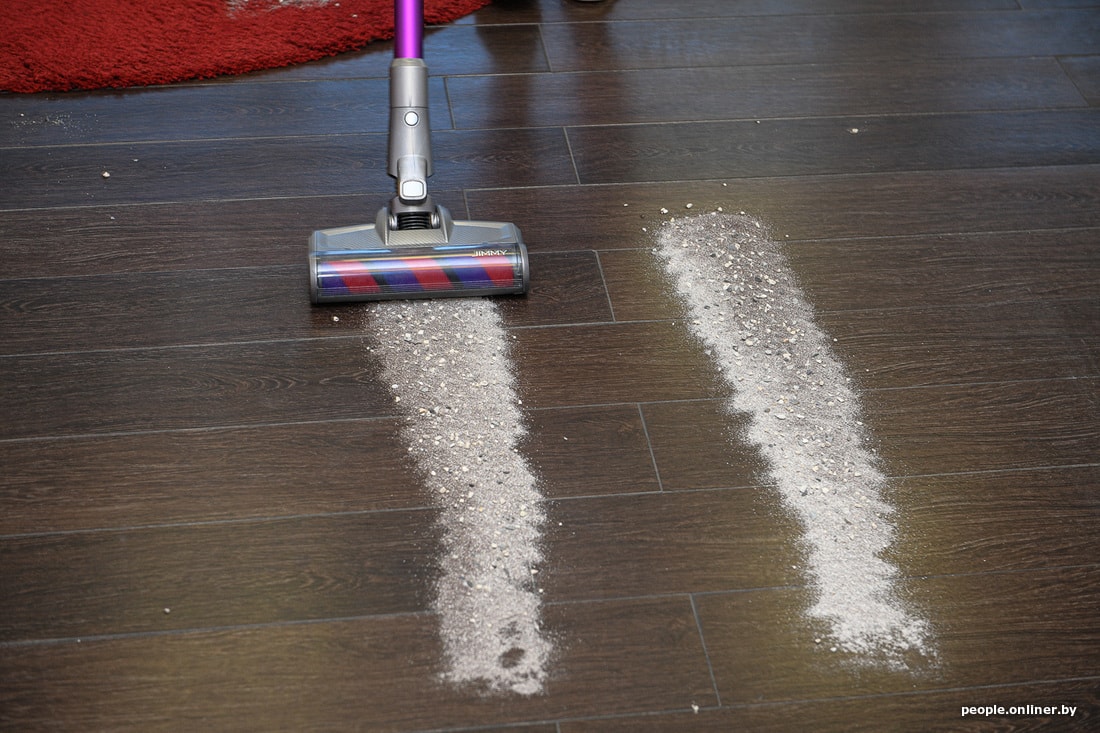 На ковре с длинным ворсом наиболее полно раскрыл себя Dyson. Несмотря на свою внешнюю простоту и самую низкую заявленную мощность всасывания, очевидно, что хвалят бренд не зря. Единственный из всех, он собрал почти весь мусор с пушистого ковра (57 граммов из 60). Три модели — Xiaomi, Viomi и Jimmy — справились одинаково, но чуть хуже: 52 грамма из 60. Очевидный аутсайдер в этом испытании — Dreame — оставил в ковре почти треть мусора от разбросанного. 41 грамм из 60 — это далеко не идеальный результат. Но модель для ковров, как мы помним, и не создана.