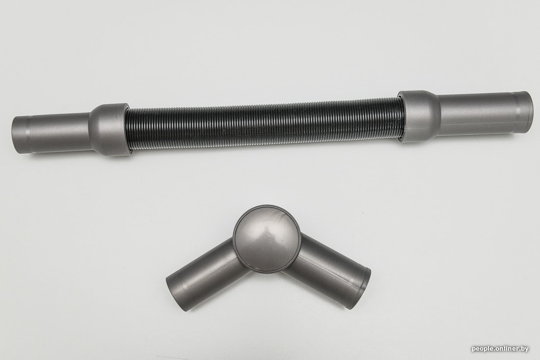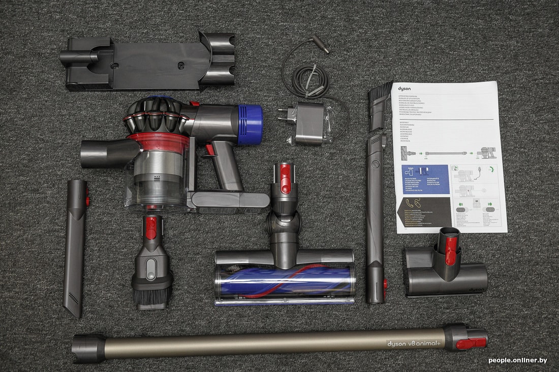 Ну и наконец, Dyson V8 Animal+. Бренд давно на слуху и занимает прочные позиции в премиум-сегменте. Так ли пылесос хорош, как о нем говорят консультанты, — мы проверим ниже, ну а пока рассмотрим комплектацию. Основная электрощетка, мини-электрощетка, щелевая насадка и насадка 2-в-1 — все это мы уже видели выше. А вот гибкая щелевая насадка со съемной щетиной — это уже действительно что-то новенькое! База для хранения простая, без функции зарядки. Максимальное время работы от аккумулятора — около 40 минут, зарядка — 5 часов. Существуют также модификации модели с другой комплектацией, сравнить их можно по ссылке.