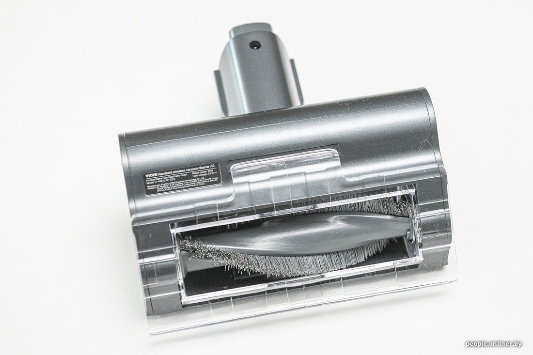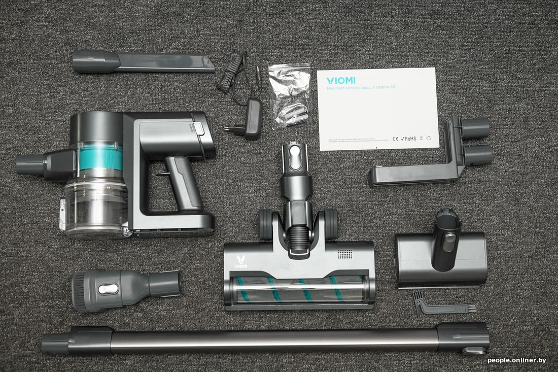 Viomi A9 поставляется с электрощеткой, которая имеет светодиодную подсветку. Мини-электрощетка, как и у модели выше, используется для мягкой обивки. Помимо этого, в комплект входят насадка 2-в-1 и узкая щелевая насадка, а также кронштейн на стену. Аккумулятор съемный, литий-ионный. Максимальное время работы — примерно 1 час, время зарядки — 3,5 часа.