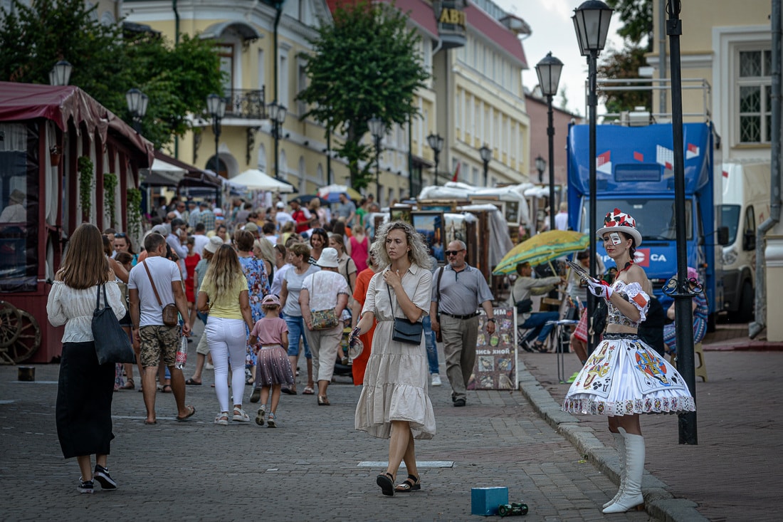 Музыка на пешеходной улице доносилась из всех углов. Мужчины сжимали и растягивали баяны да аккордеоны, что-то напевая себе под нос. Подросток игрой на скрипке и репертуаром из двух композиций («Кукла колдуна» и что-то из «Би-2») собирал возле себя первых фанатов, которые поснимают на телефон да и рубль подкинут. Также можно было расслышать треки Тимы Белорусских, только с женским вокалом.