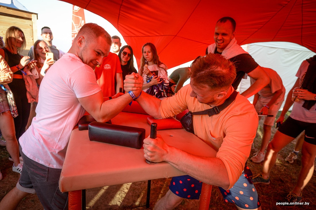 На площадке фестиваля столько шатров, палаток, сцен, ведущих и звуков, что глаз не может за что-то ухватиться: слева ребята играют в пляжный волейбол, справа проходит танцевальный мастер-класс, а позади люди все еще верят, что могут выиграть на аттракционах из серии «пролезь по лестнице — выиграй 100 рублей» (таких тут очень много). Люди выкручивают друг другу руки в армрестлинге, набивают брюхо чебуреками и пробивают мячом «девятку» за призы.